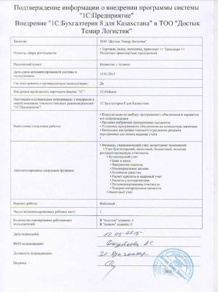 | Внедренное типовое решение: | 1С:Бухгалтерия 8 для Казахстана |