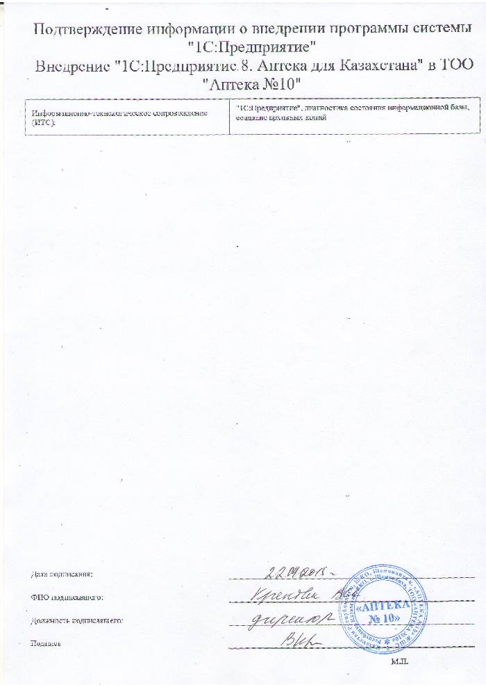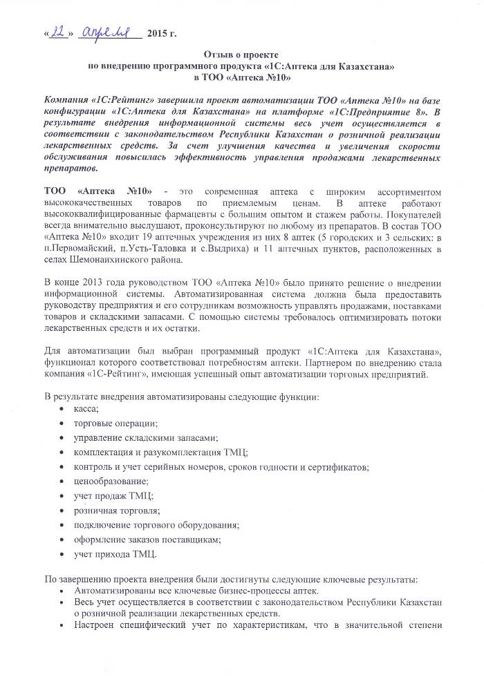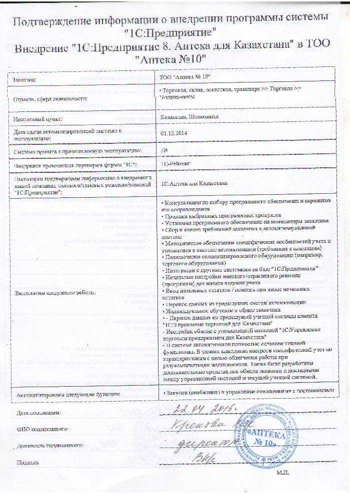 | Внедренное отраслевое решение: | 1С:Аптека для Казахстана |