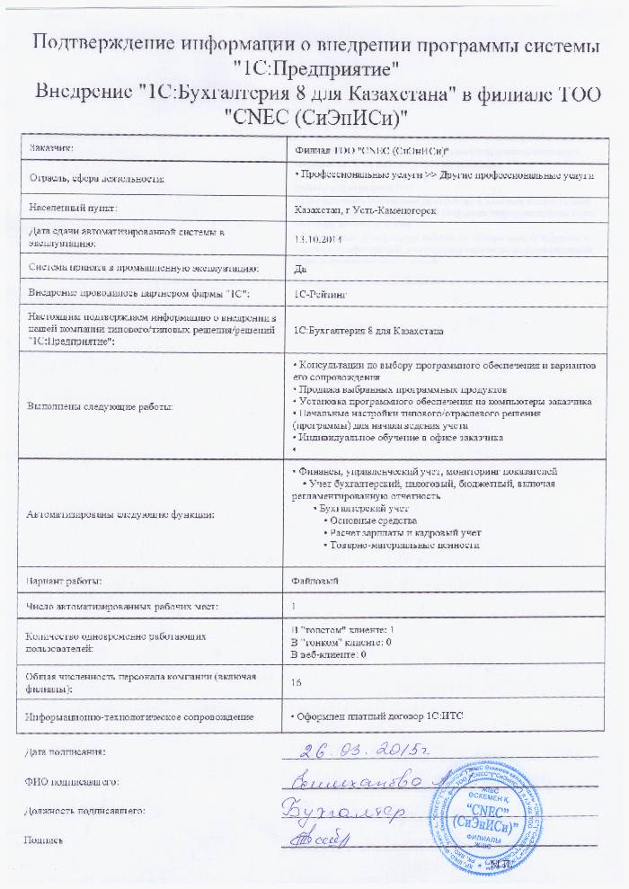| Внедренное типовое решение: | 1С:Бухгалтерия 8 для Казахстана |