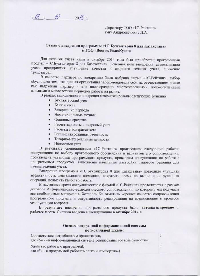 | Внедренное типовое решение: | 1С:Бухгалтерия 8 для Казахстана |