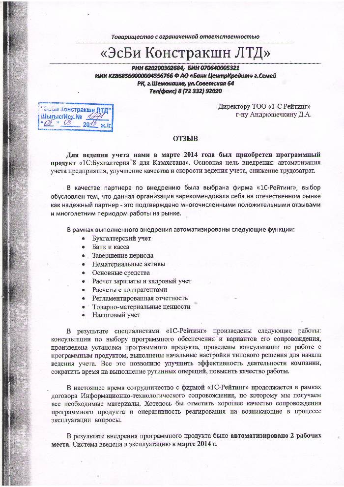 | Внедренное типовое решение: | 1С:Бухгалтерия 8 для Казахстана |