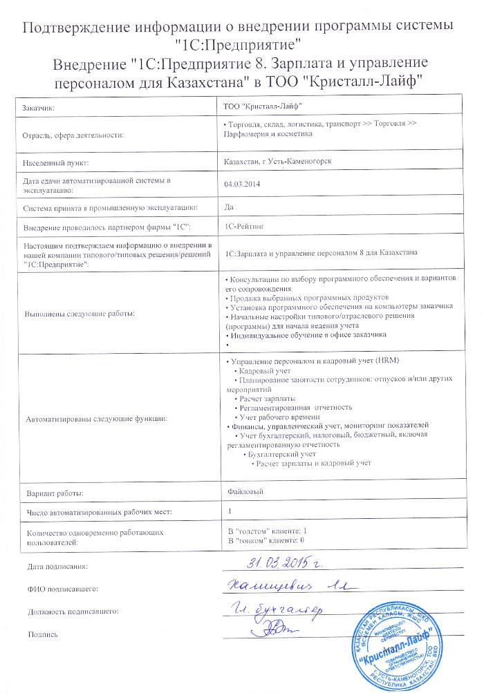 | Внедренное типовое решение: | 1С:Зарплата и управление персоналом 8 для Казахстана |