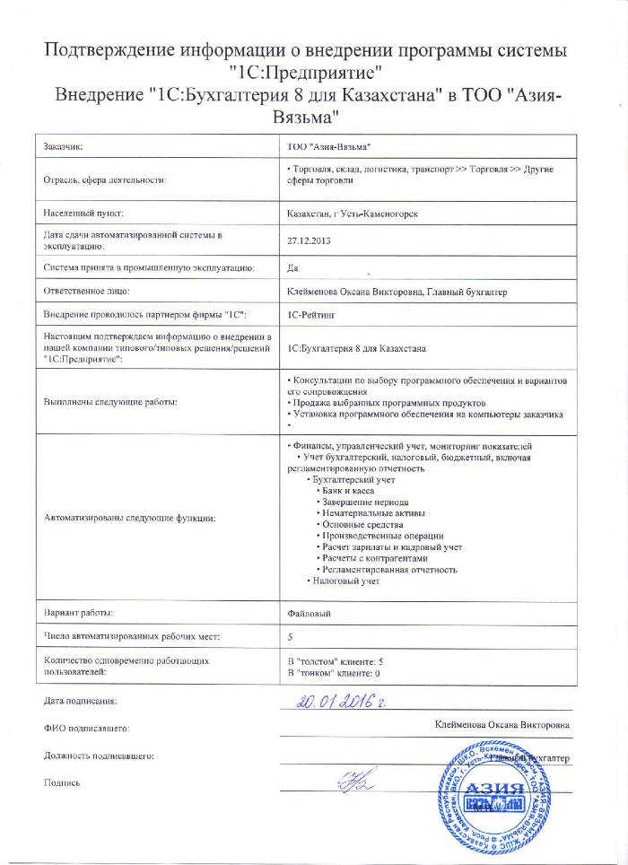 | Внедренное типовое решение: | 1С:Бухгалтерия 8 для Казахстана |