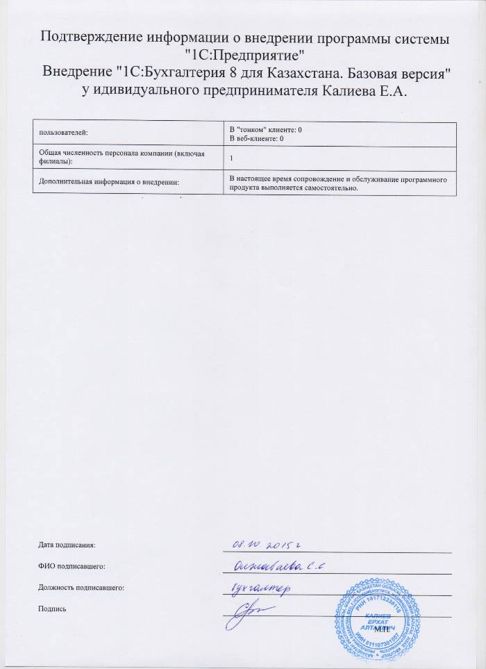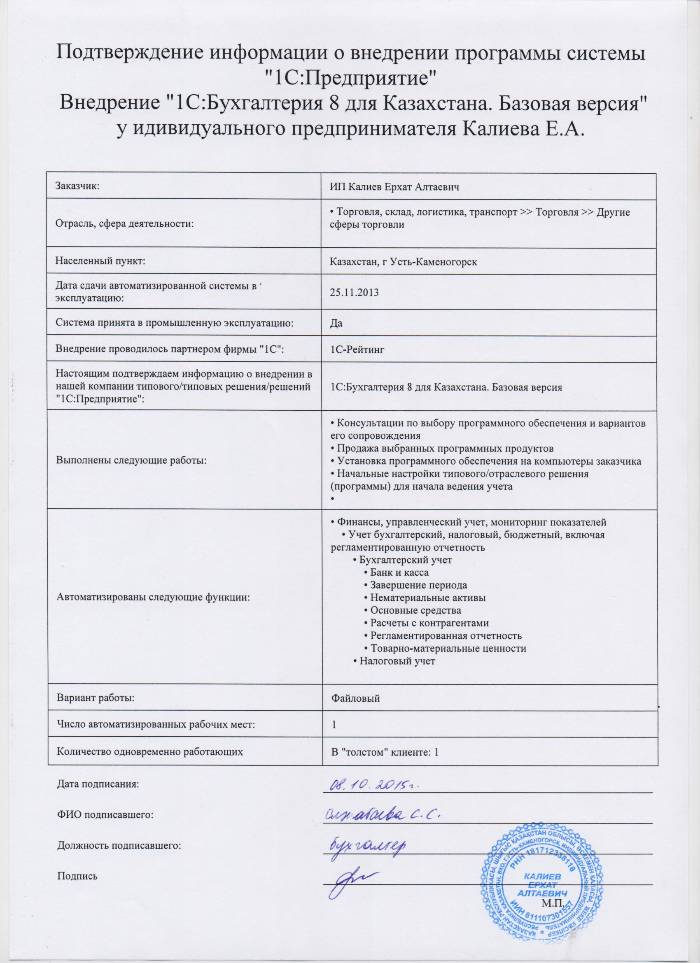 | Внедренное типовое решение: | 1С:Бухгалтерия 8 для Казахстана. Базовая версия |