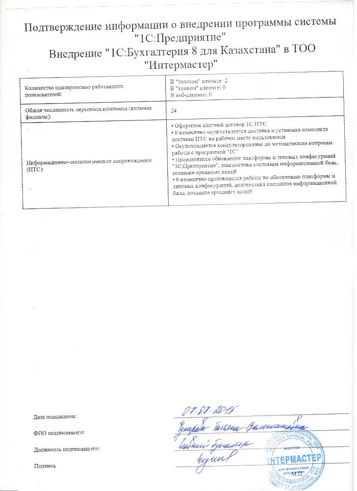 | Внедренное типовое решение: | 1С:Бухгалтерия 8 для Казахстана |