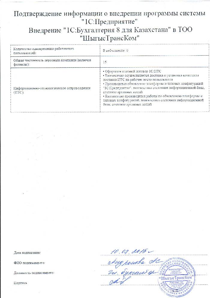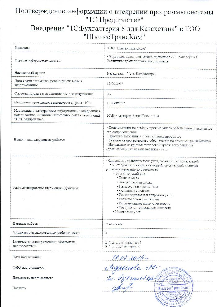 | Внедренное типовое решение: | 1С:Бухгалтерия 8 для Казахстана |