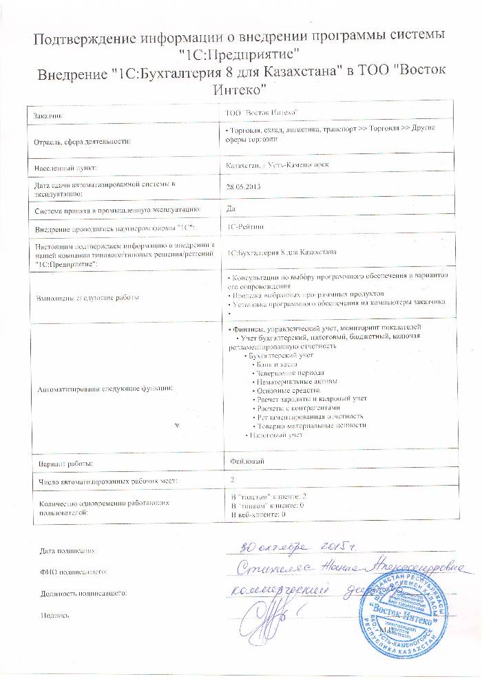 | Внедренное типовое решение: | 1С:Бухгалтерия 8 для Казахстана |