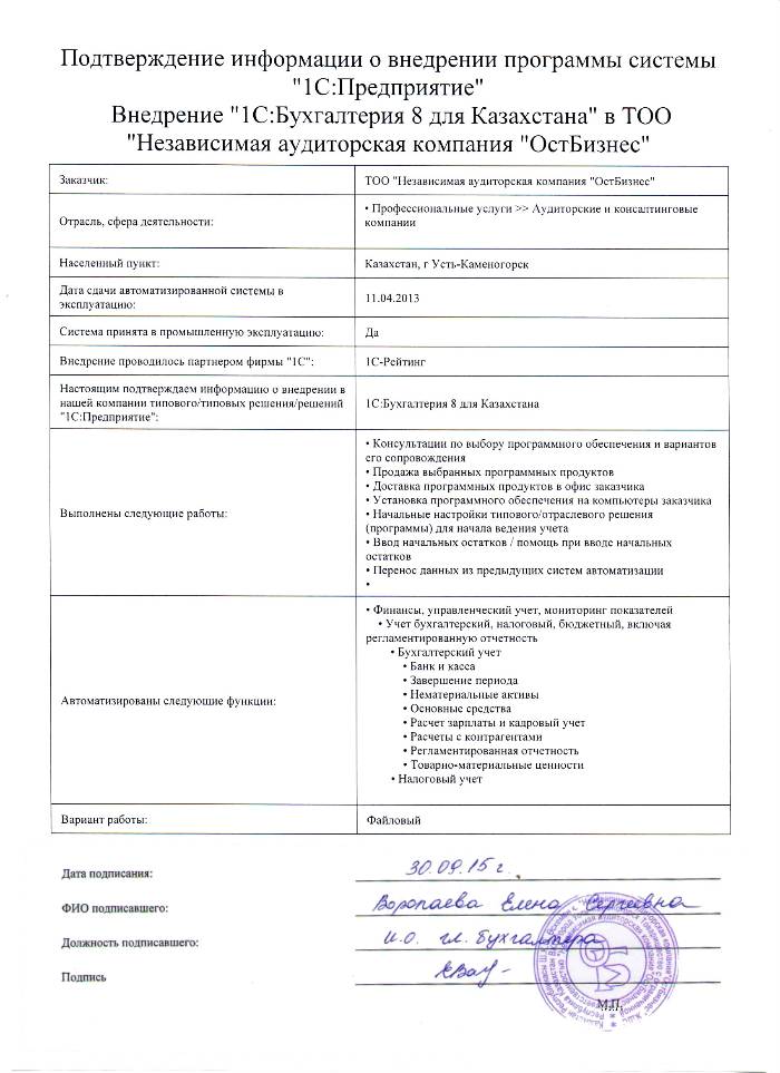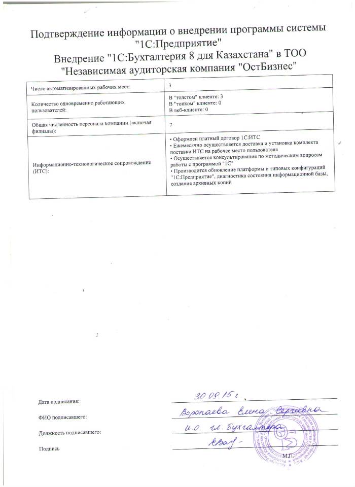 | Внедренное типовое решение: | 1С:Бухгалтерия 8 для Казахстана |