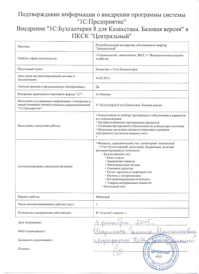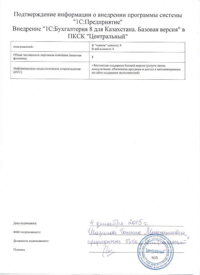| Внедренное типовое решение: | 1С:Бухгалтерия 8 для Казахстана. Базовая версия |