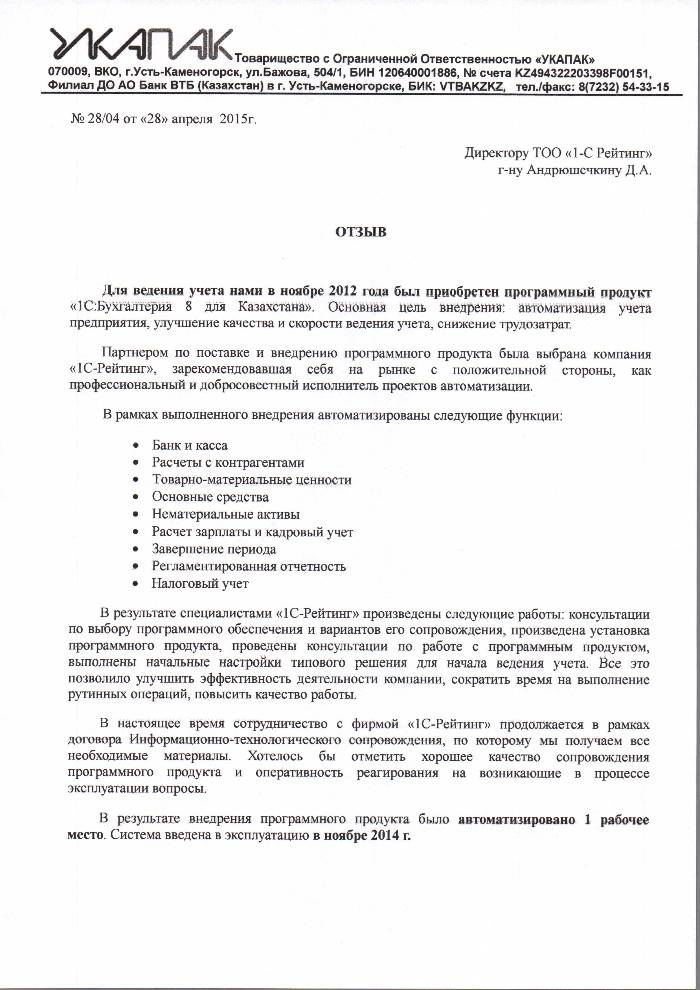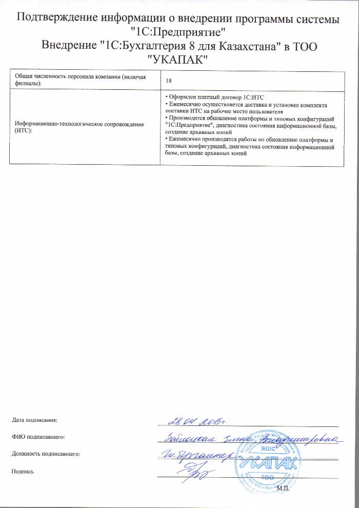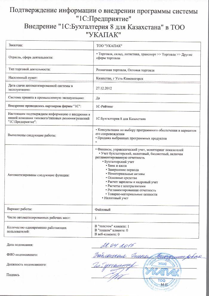 Внедрение 1С:Бухгалтерия 8 для Казахстана в ТОО УКАПАК