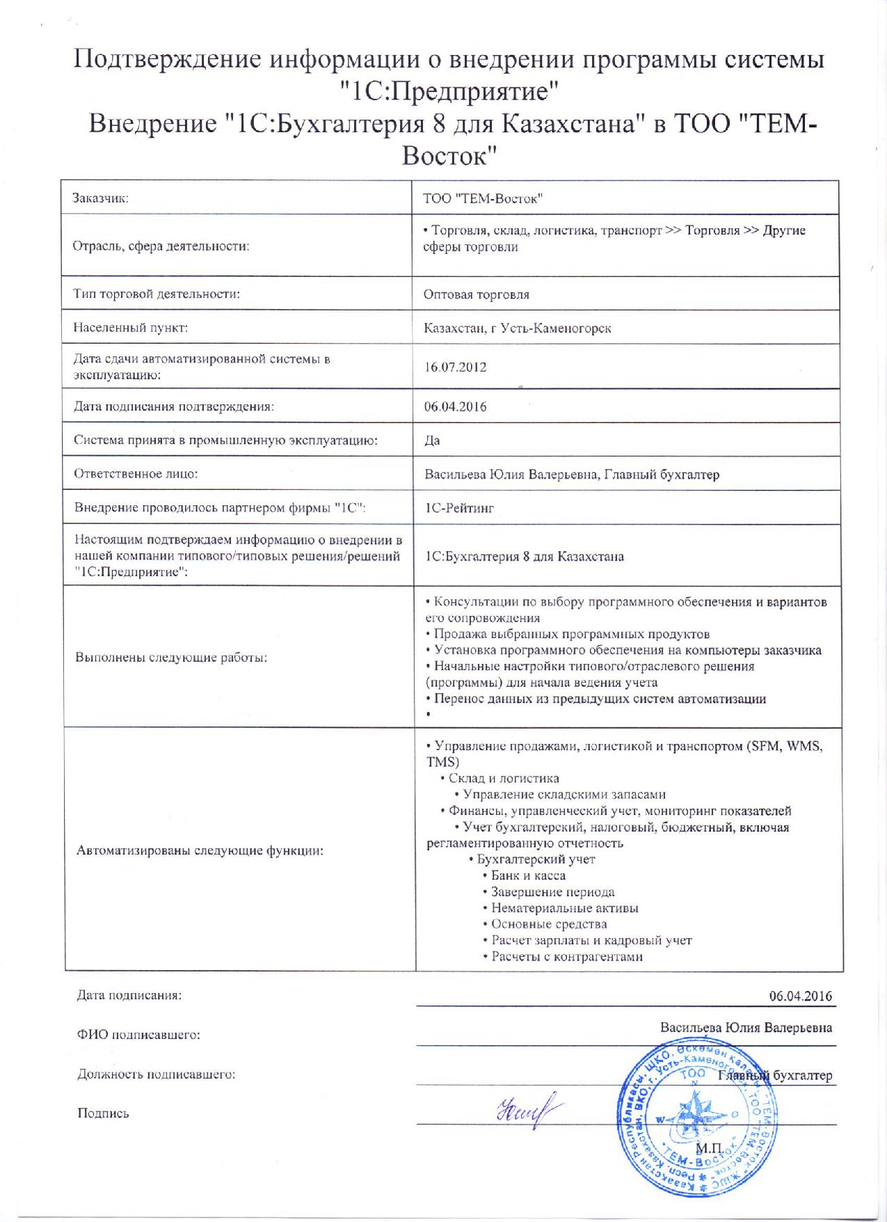 | Внедренное типовое решение: | 1С:Бухгалтерия 8 для Казахстана |