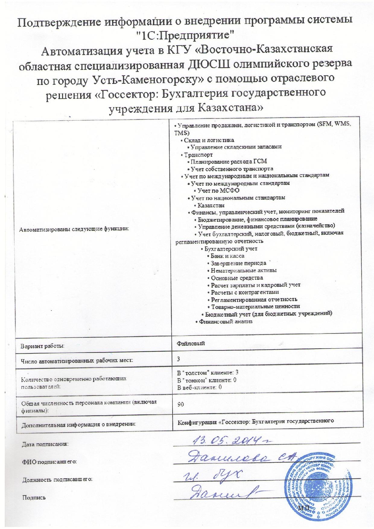 Внедрение «Госсектор: Бухгалтерия государственного учреждения для Казахстана» в КГУ «Восточно-Казахстанская областная специализированная ДЮСШ олимпийского резерва по городу Усть-Каменогорску»