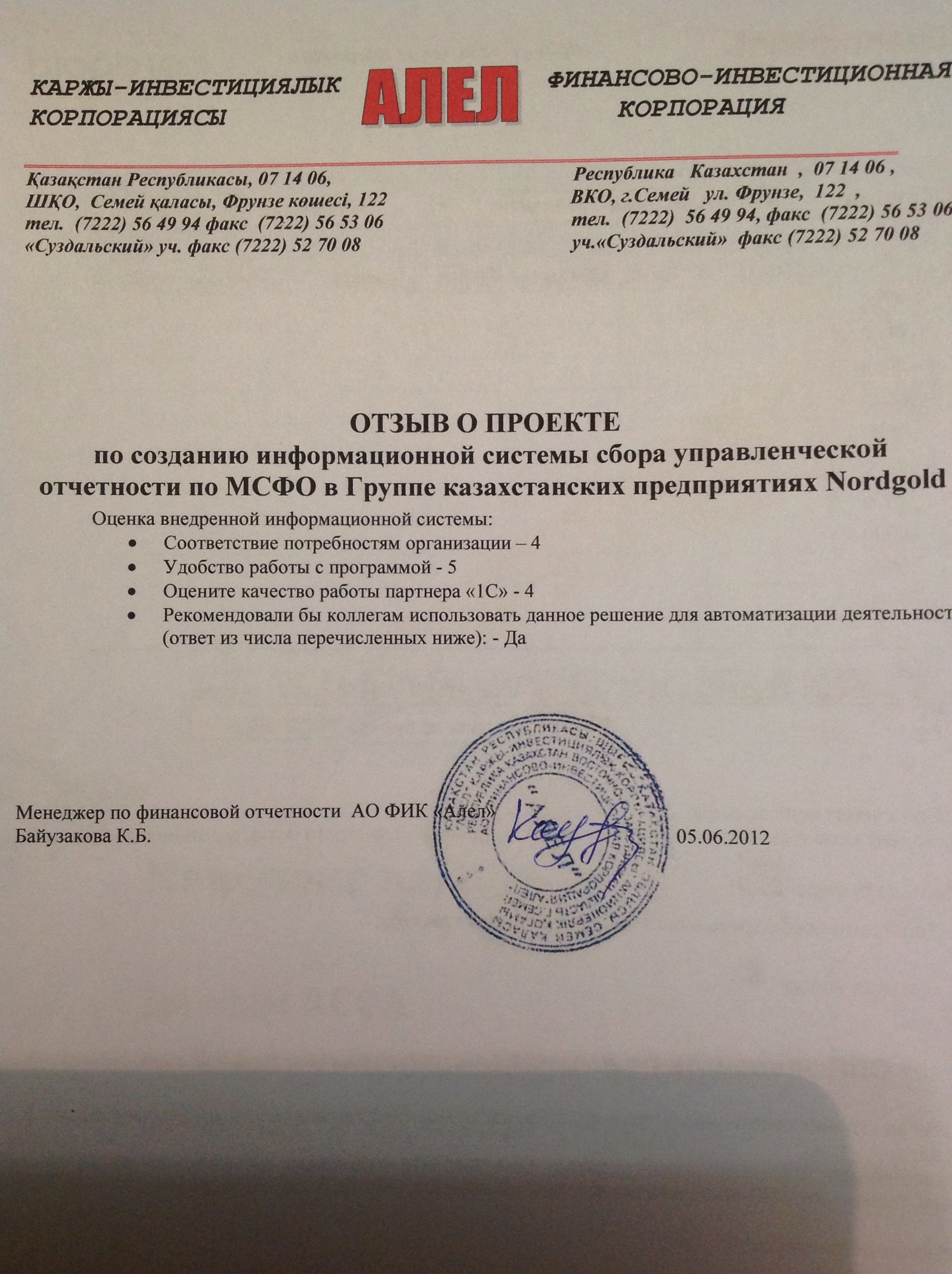 Учитывая потребность в оперативном предоставлении заполненных форм, а также в глубоком раскрытии информации в отчетности, руководством Группы казахстанских предприятий был инициирован проект автоматизации с использованием программного продукта «1С:Консолидация 8», целью которого было максимально упростить труд менеджеров по отчетности в части рутинного сбора и заполнения данных. В качестве партнера для реализации проекта была привлечена компания «1С-Рейтинг», с которой имелся успешный опыт сотрудничества на внедрении комплексной информационной системы на базе «1С:Управление производственным предприятием 8 для Казахстана» (руководитель проекта со стороны Заказчика Равба Максим Николаевич).
