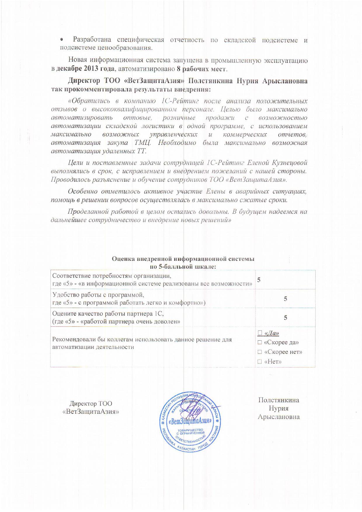 | Внедренное типовое решение: | 1С:Управление торговлей 8 для Казахстана |