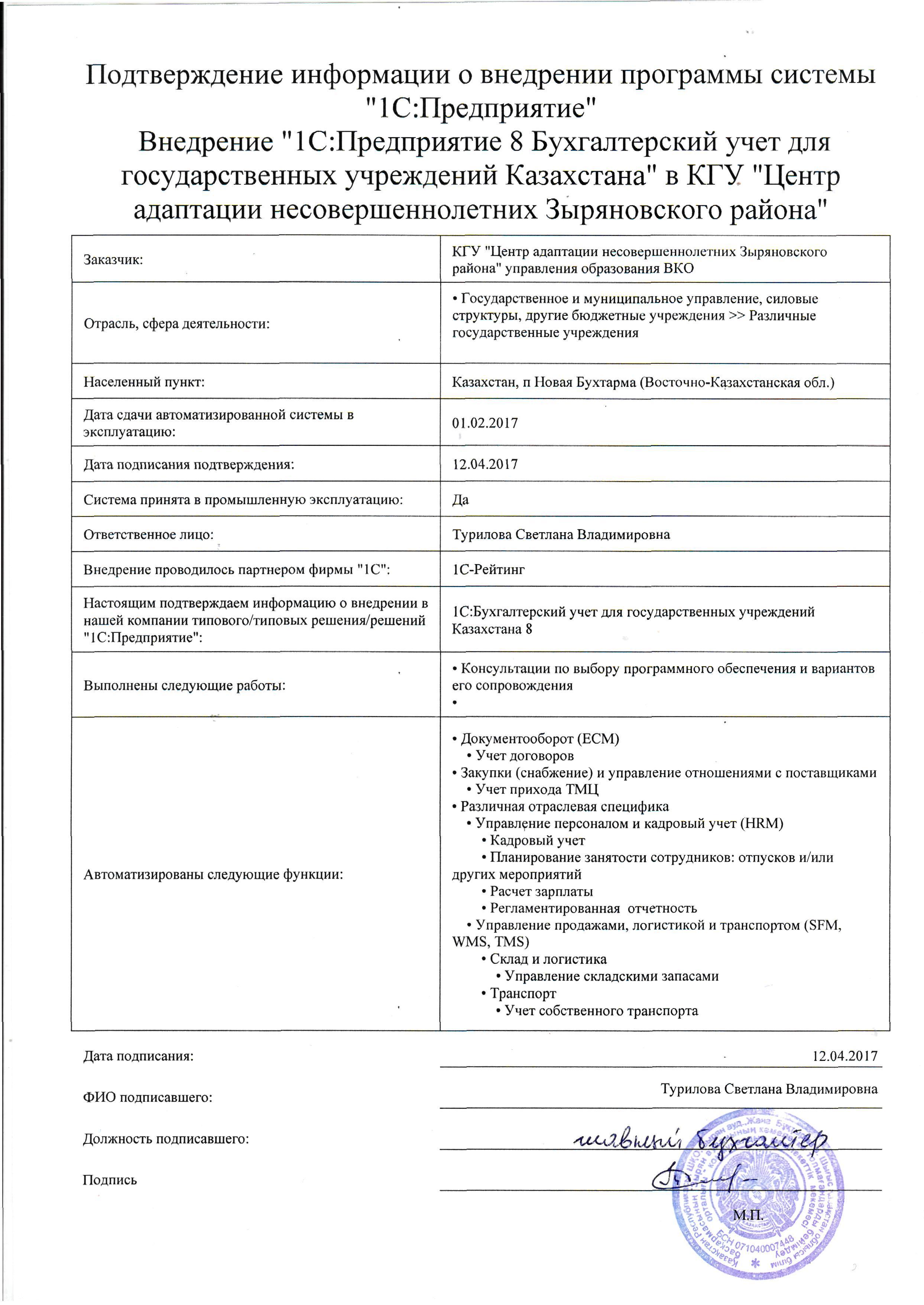Внедрение «1С:Бухгалтерский учет для государственных учреждений Казахстана» в КГУ «Центр адаптации несовершеннолетних Зыряновского района»