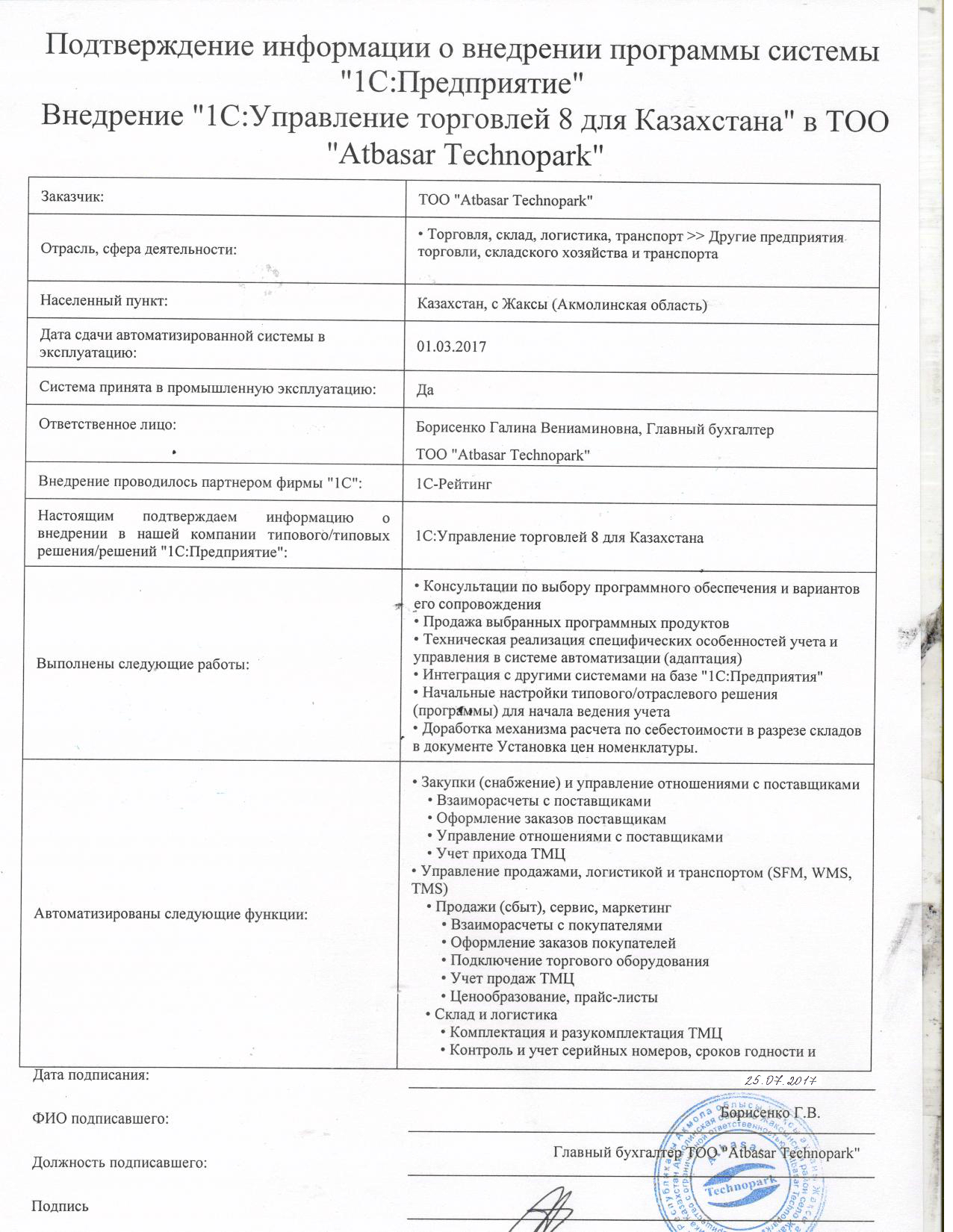 | Внедренное типовое решение: | 1С:Управление торговлей 8 для Казахстана |