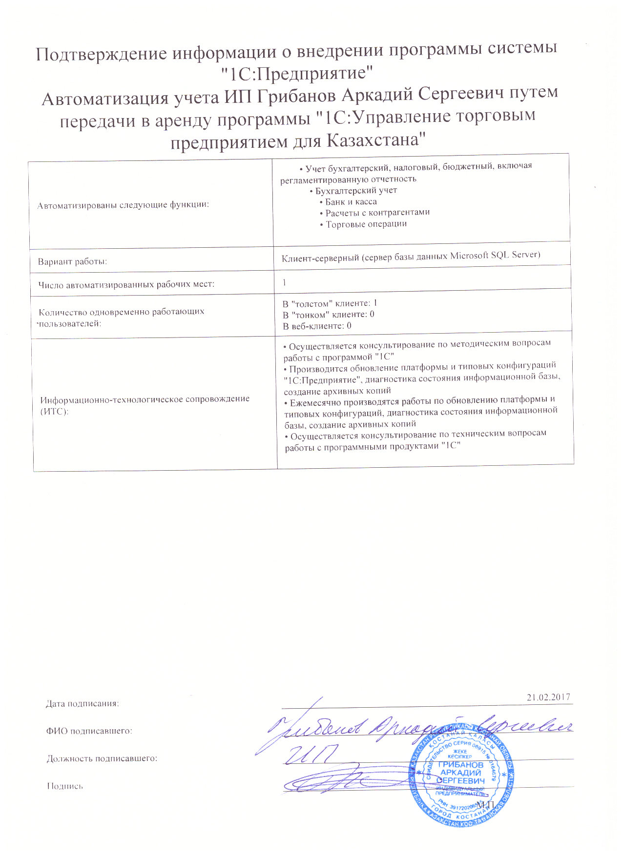 | Арендованное типовое решение: | 1С:Управление торговым предприятием для Казахстана |