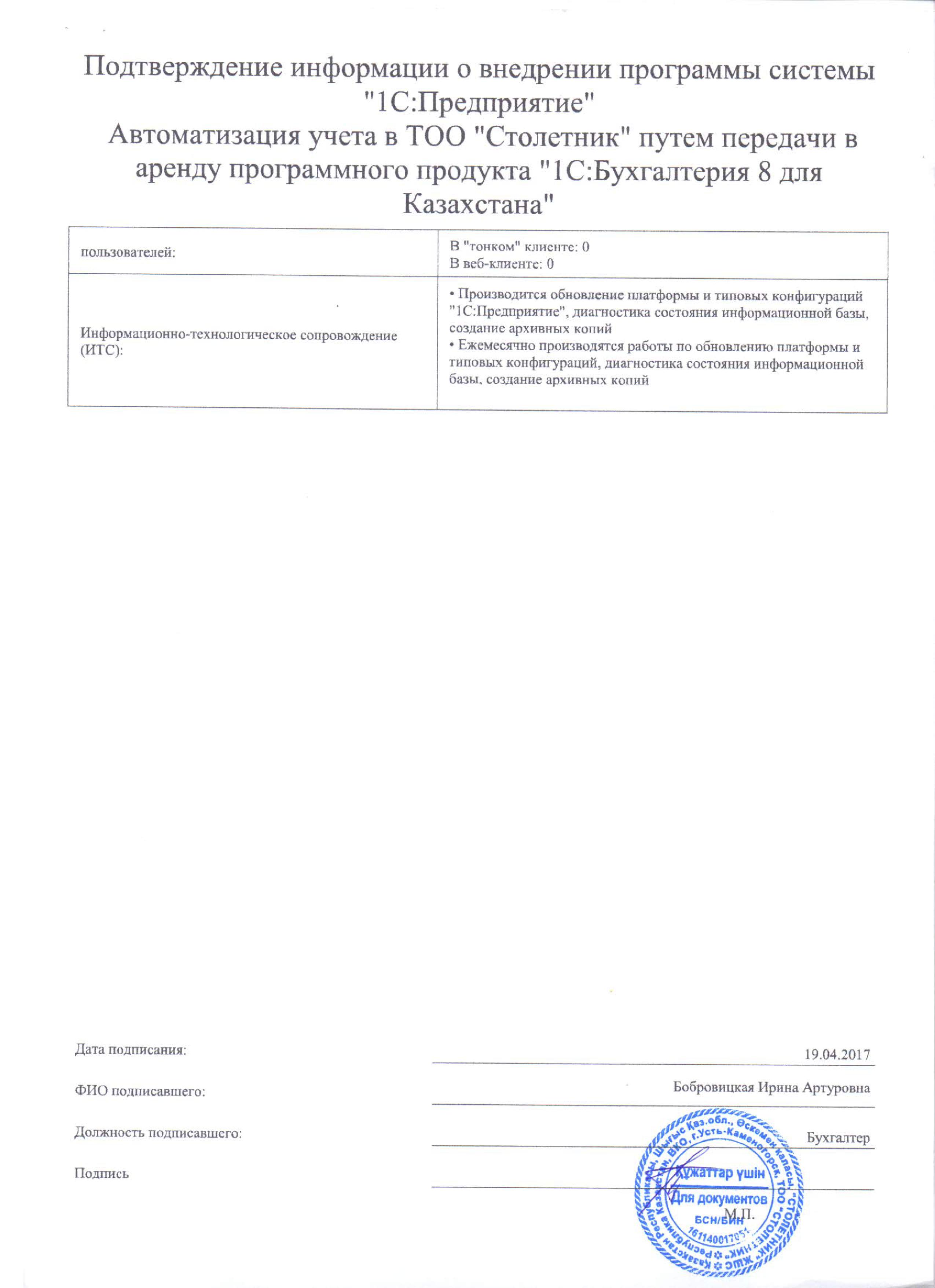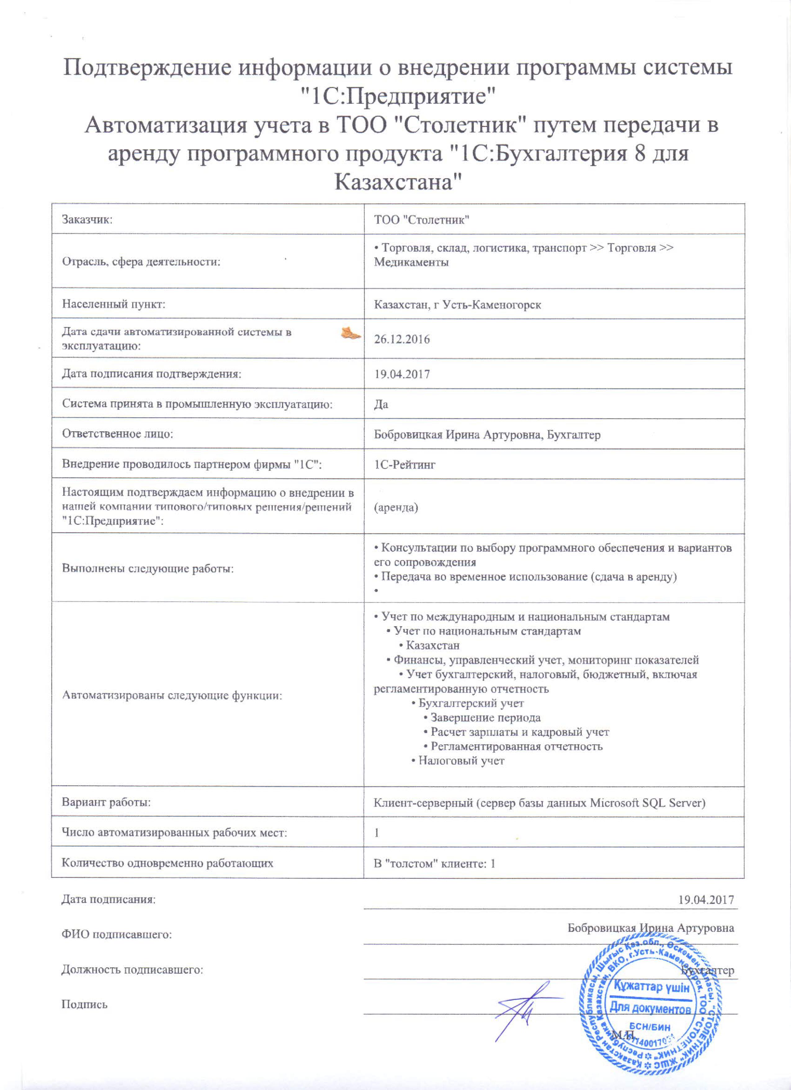 | Арендованное типовое решение: | 1С:Бухгалтерия для Казахстана |