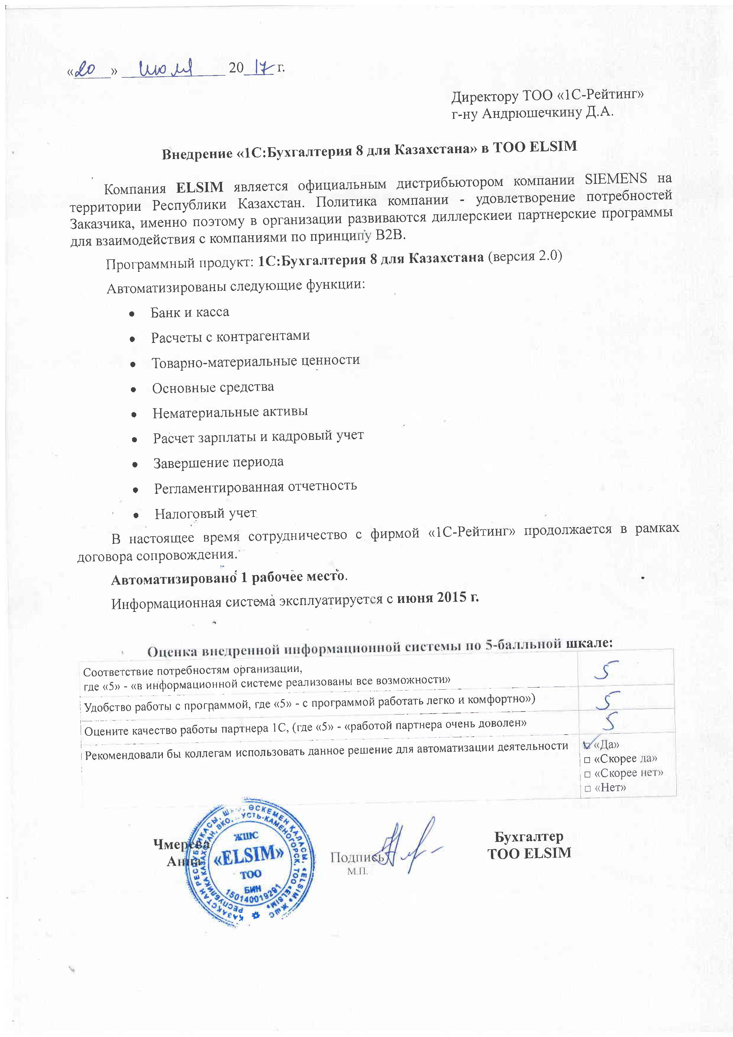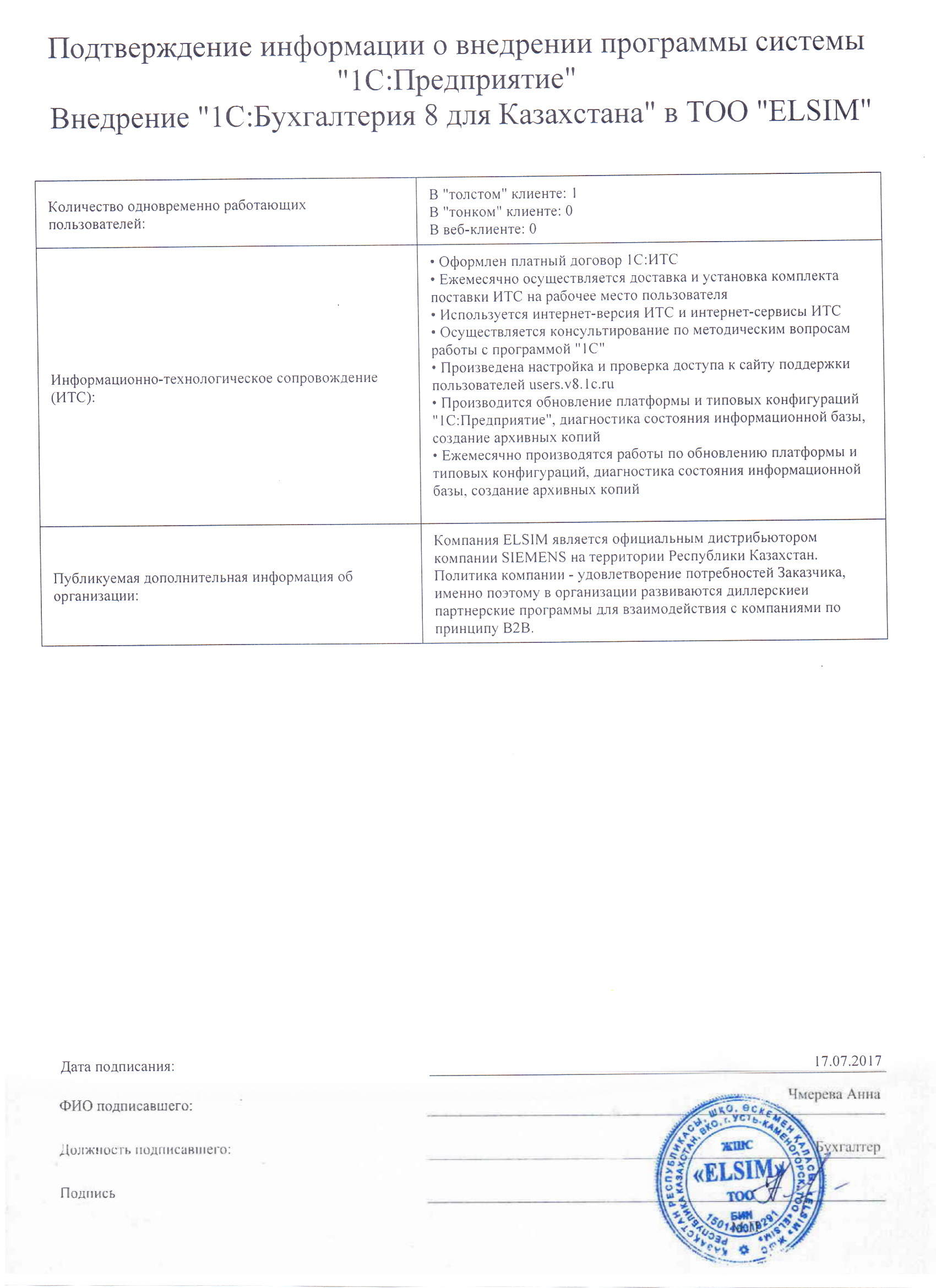 Внедрение «1С:Бухгалтерия 8 для Казахстана» в ТОО «ELSIM»