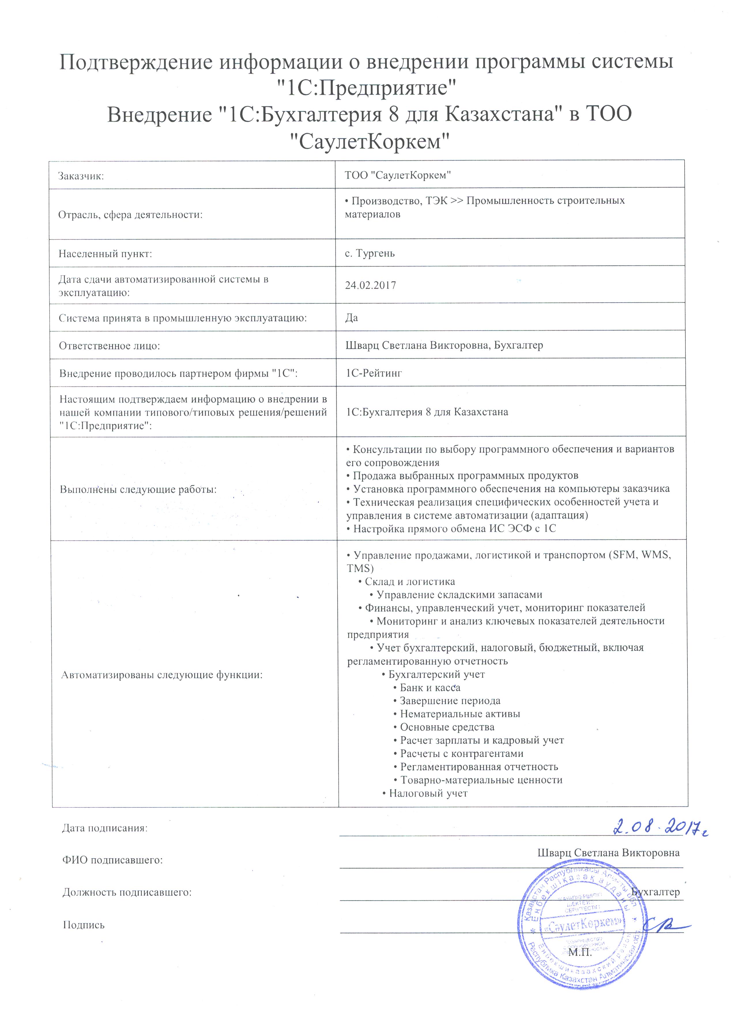 | Внедренное типовое решение: | 1С:Бухгалтерия 8 для Казахстана |