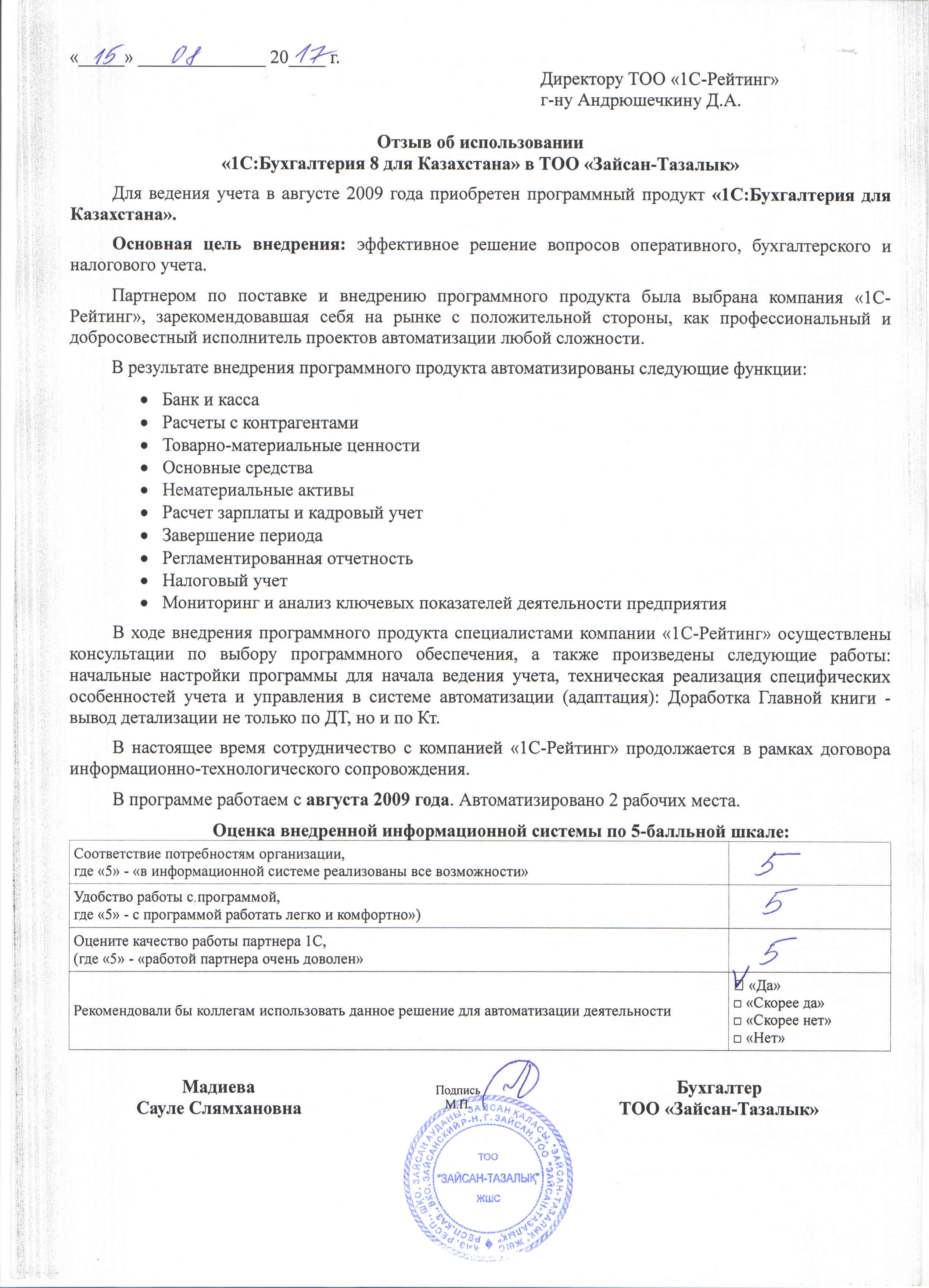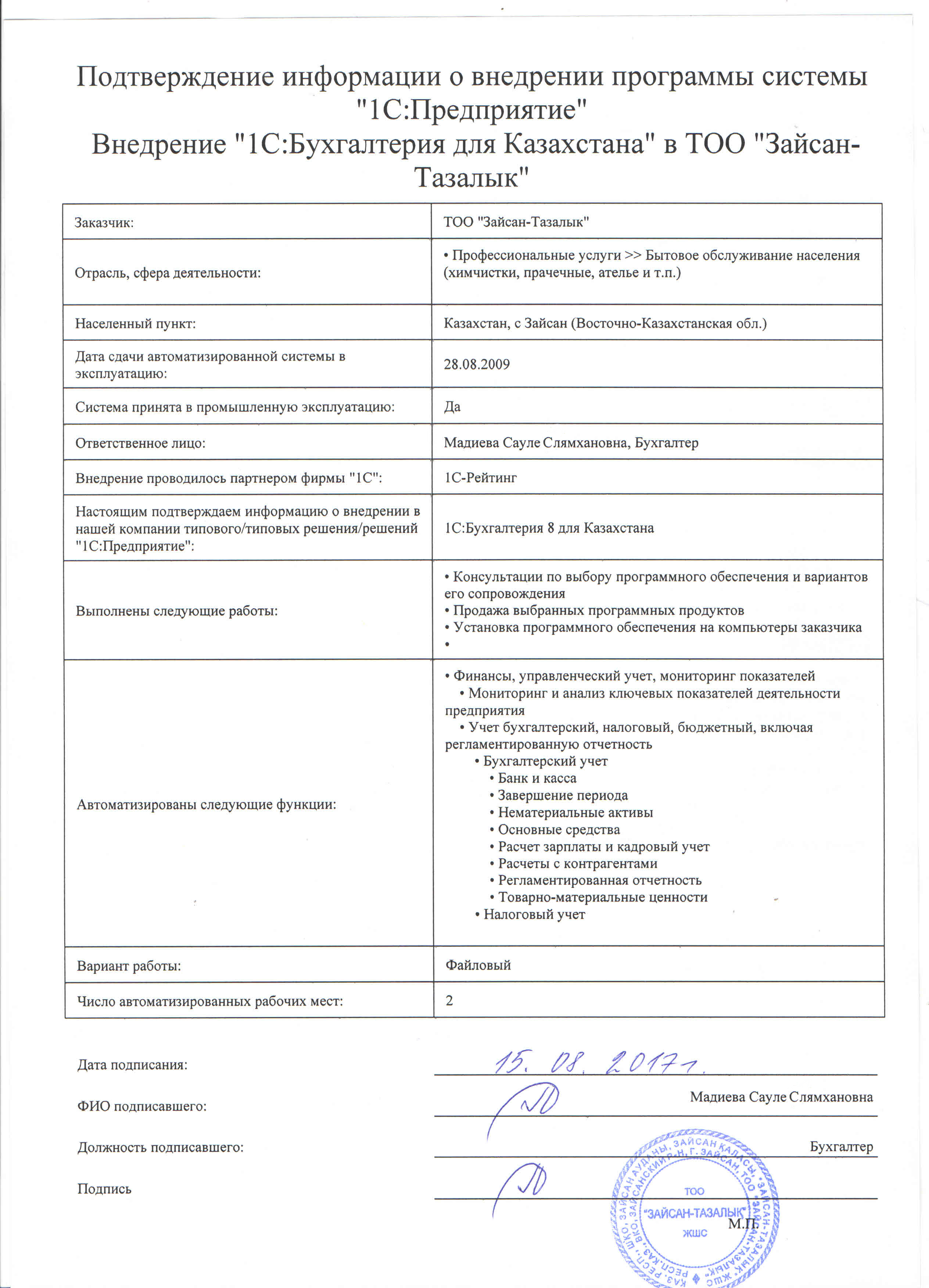 | Внедренное типовое решение: | 1С:Бухгалтерия 8 для Казахстана |