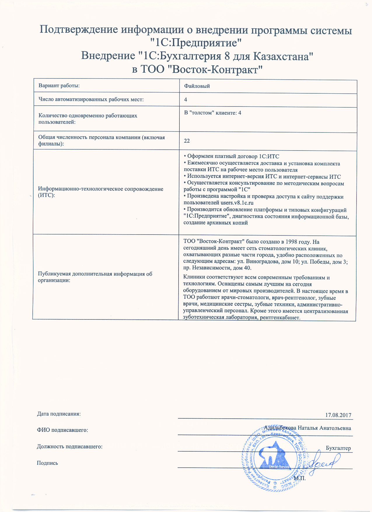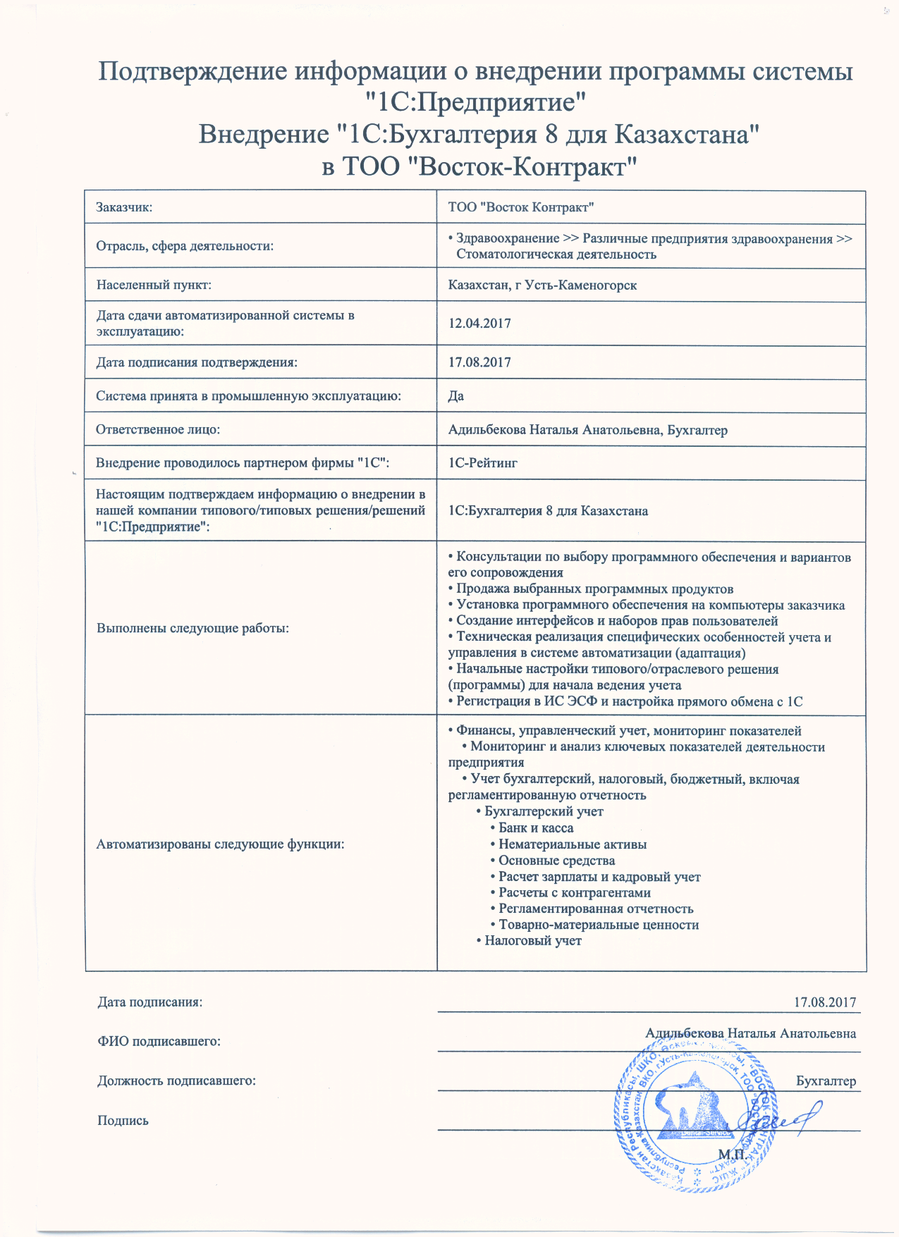 | Внедренное типовое решение: | 1С:Бухгалтерия 8 для Казахстана |