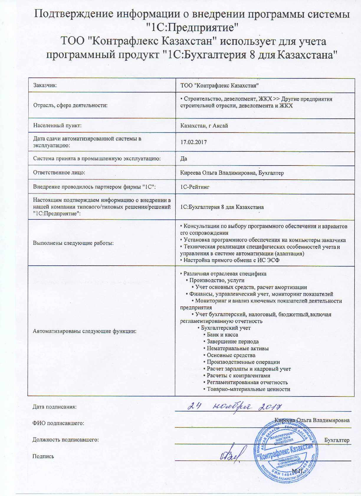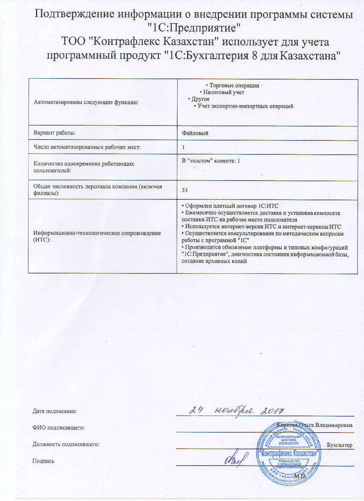 | Внедренное типовое решение: | 1С:Бухгалтерия 8 для Казахстана |