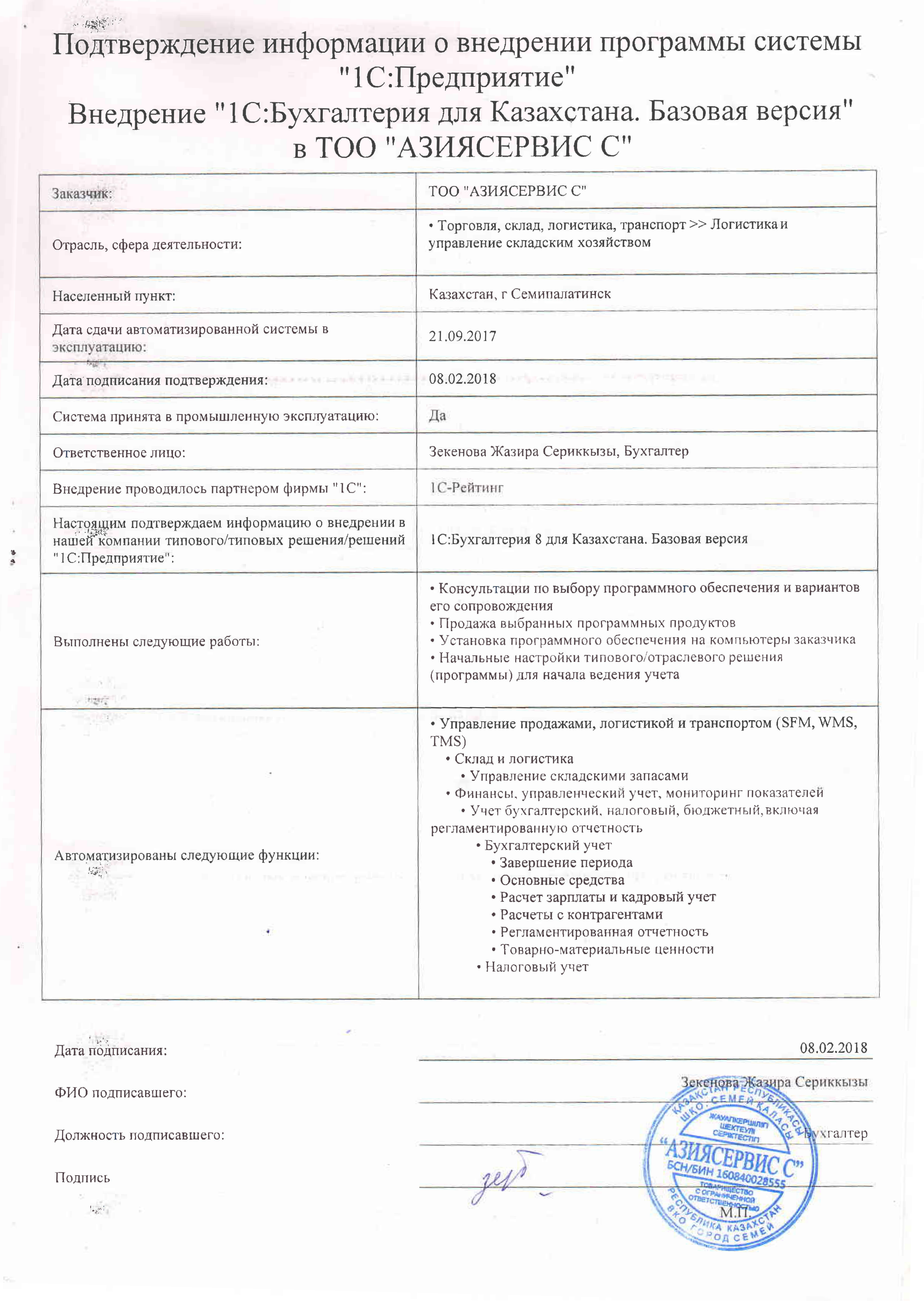 | Внедренное типовое решение: | 1С:Бухгалтерия для Казахстана. Базовая версия |