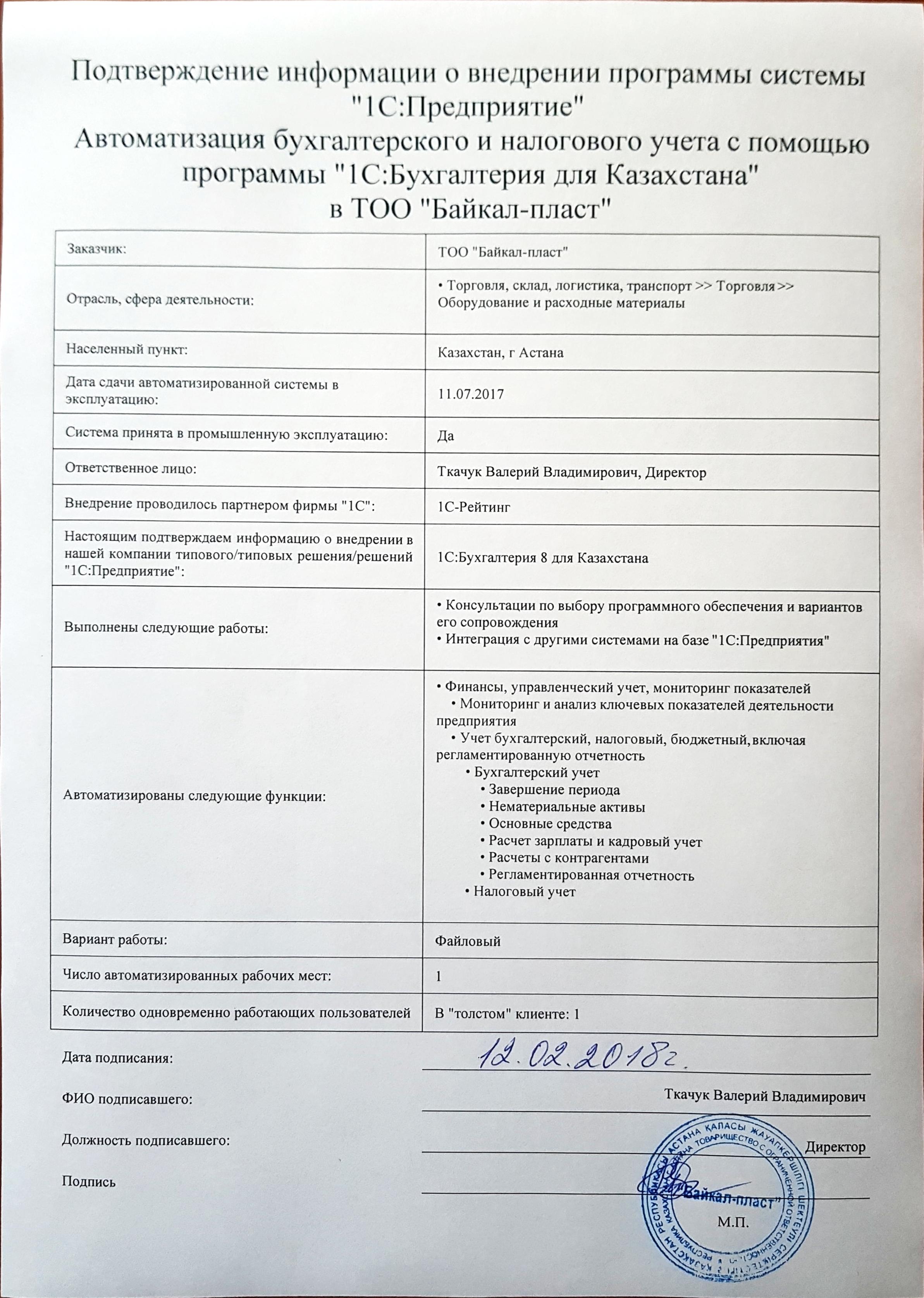 - Ежемесячно производятся работы по обновлению платформы и типовых конфигураций, диагностика состояния информационной базы, создание архивных копий