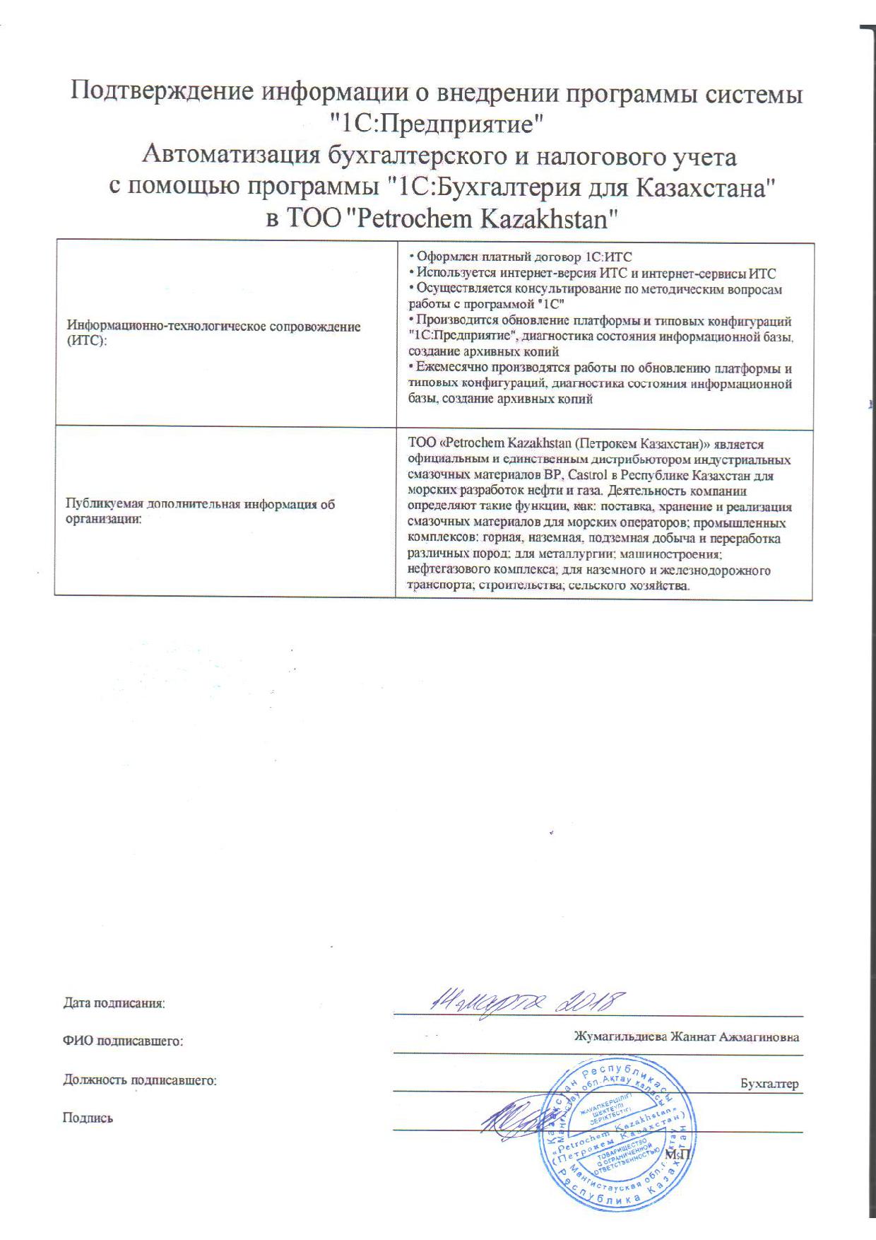 | Внедренное типовое решение: | 1С:Бухгалтерия для Казахстана |