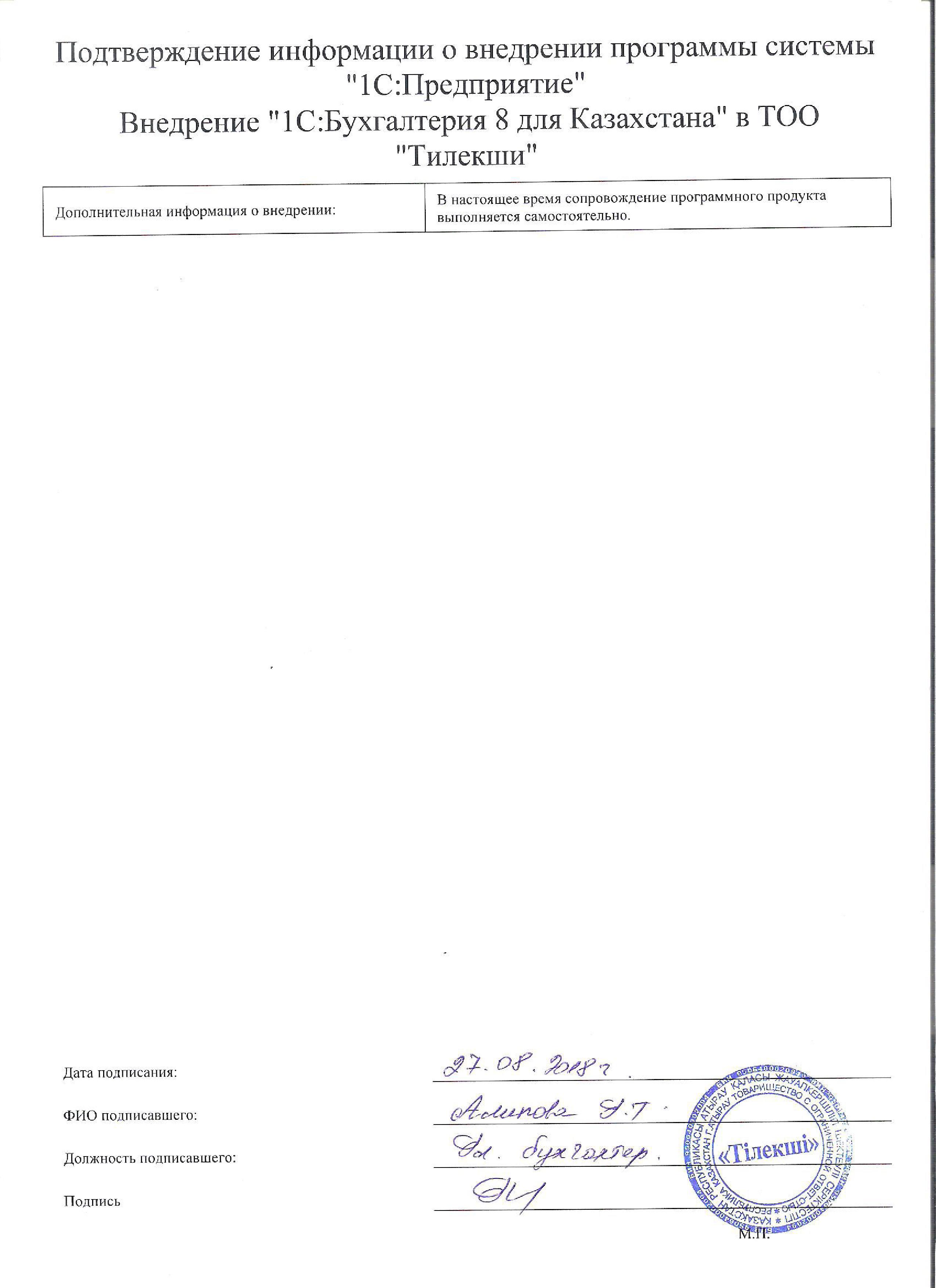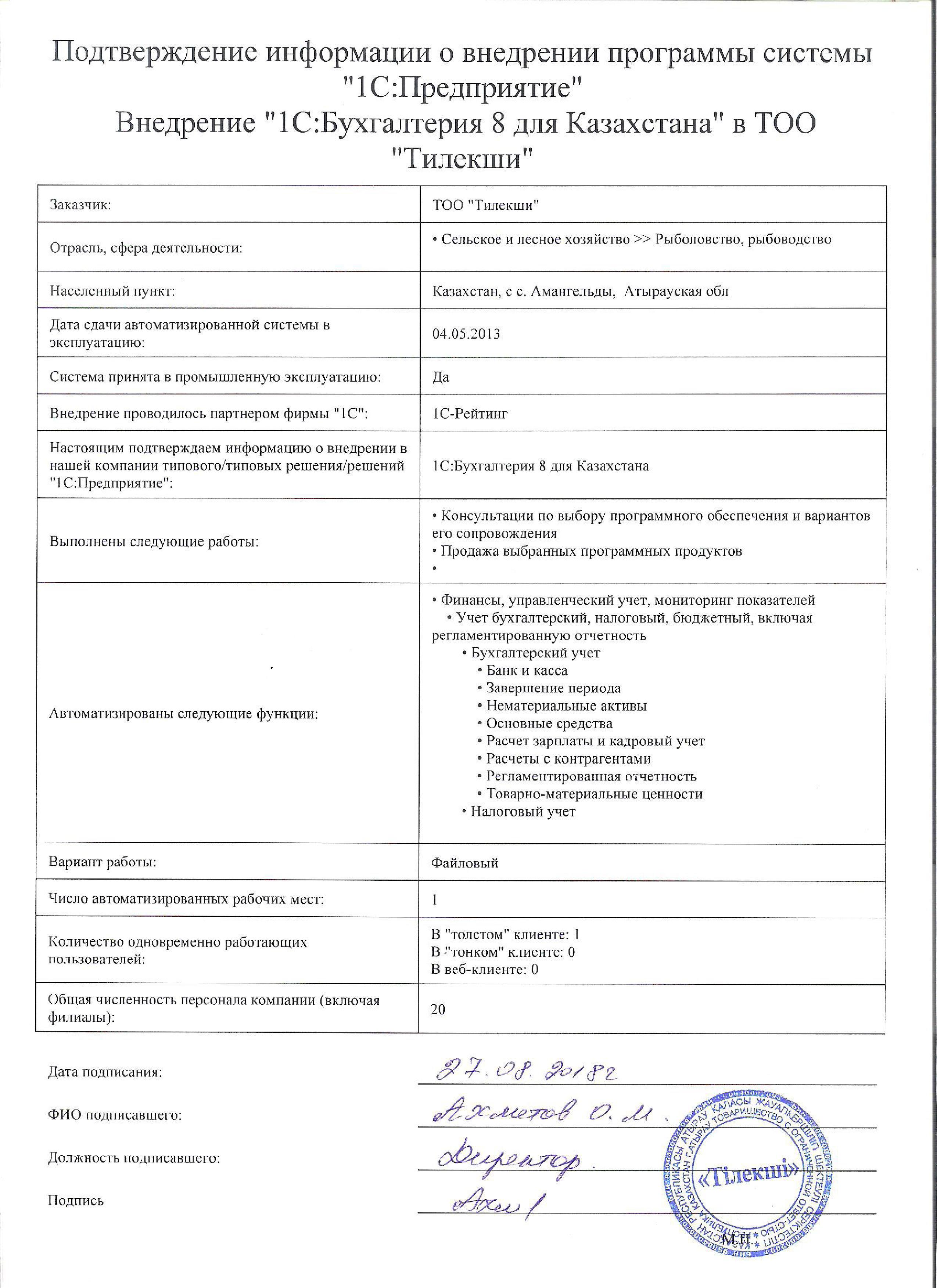 | Внедренное типовое решение: | 1С:Бухгалтерия 8 для Казахстана |