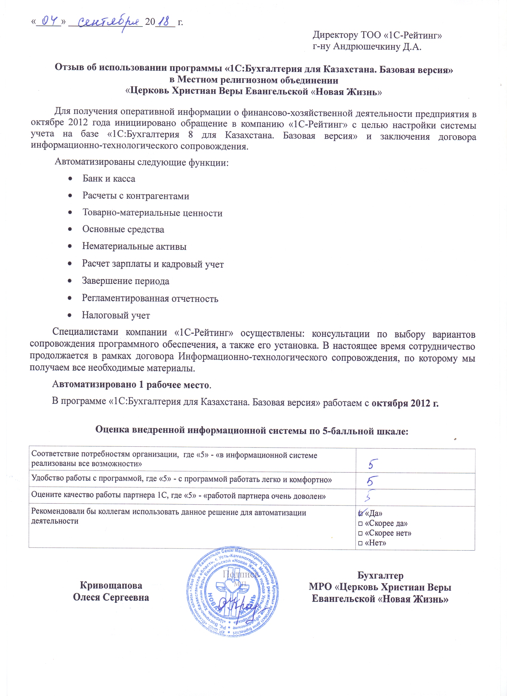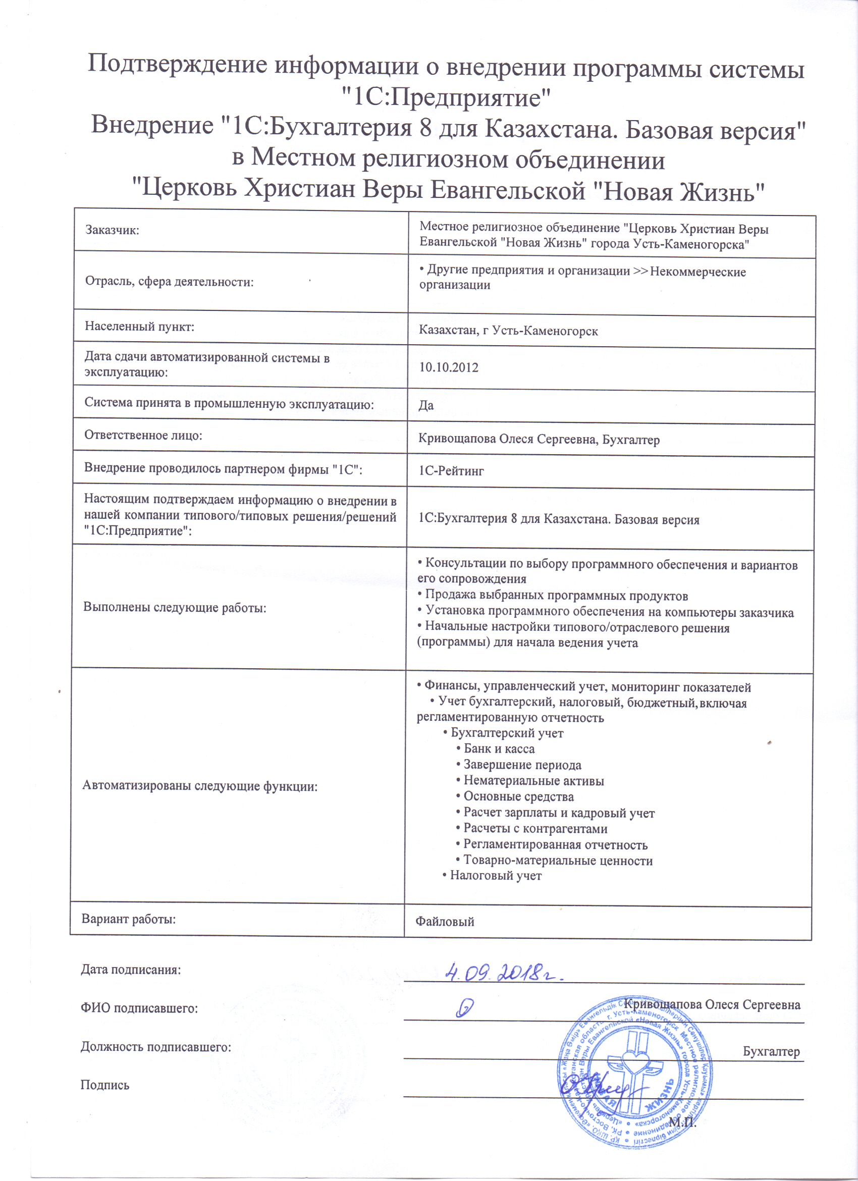 Внедрение «1С:Бухгалтерия для Казахстана. Базовая версия» в Местном религиозном объединении «Церковь Христиан Веры Евангельской «Новая Жизнь»