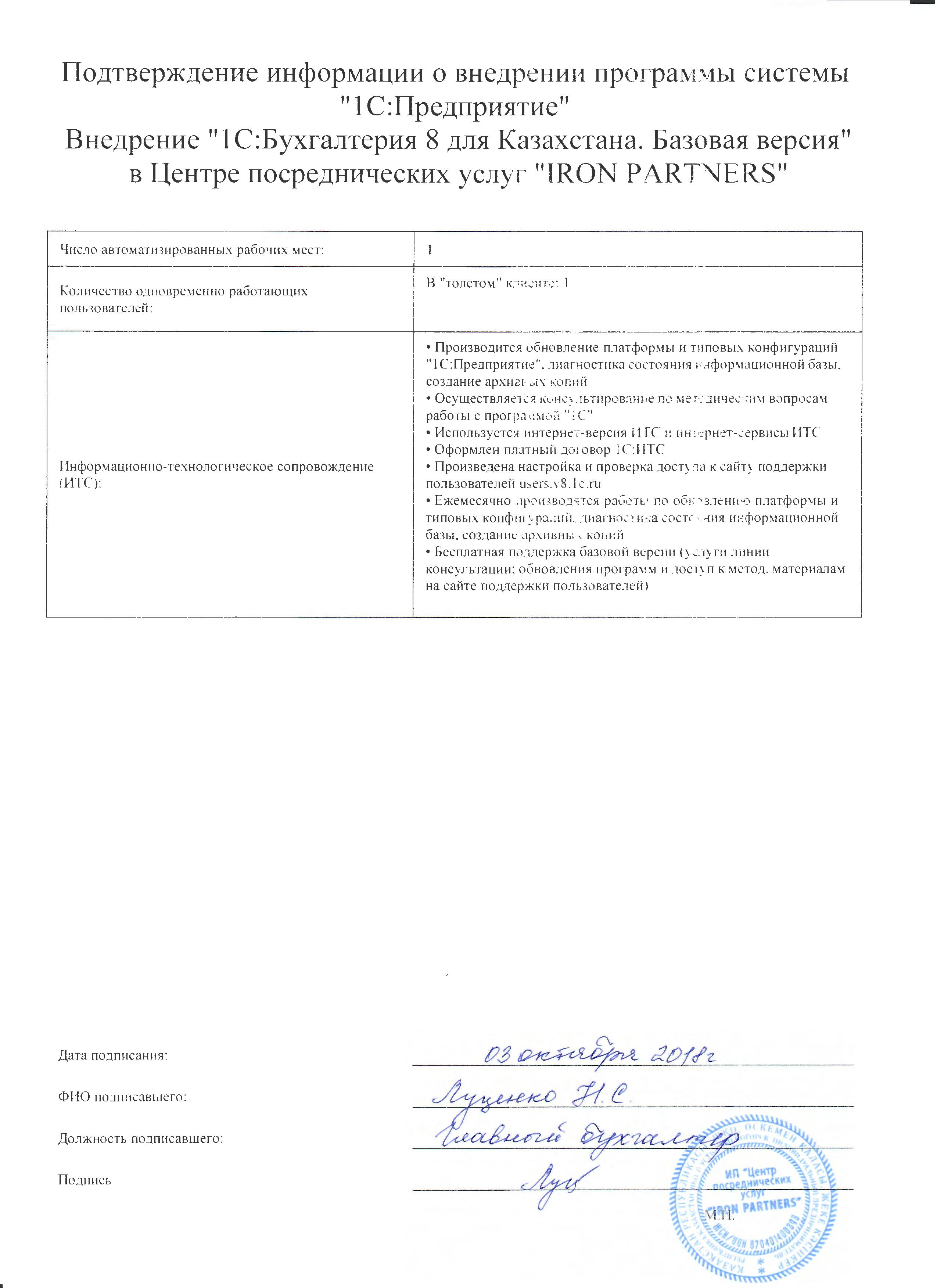 - Ежемесячно производятся работы по обновлению платформы и типовых конфигураций, диагностика состояния информационной базы, создание архивных копий