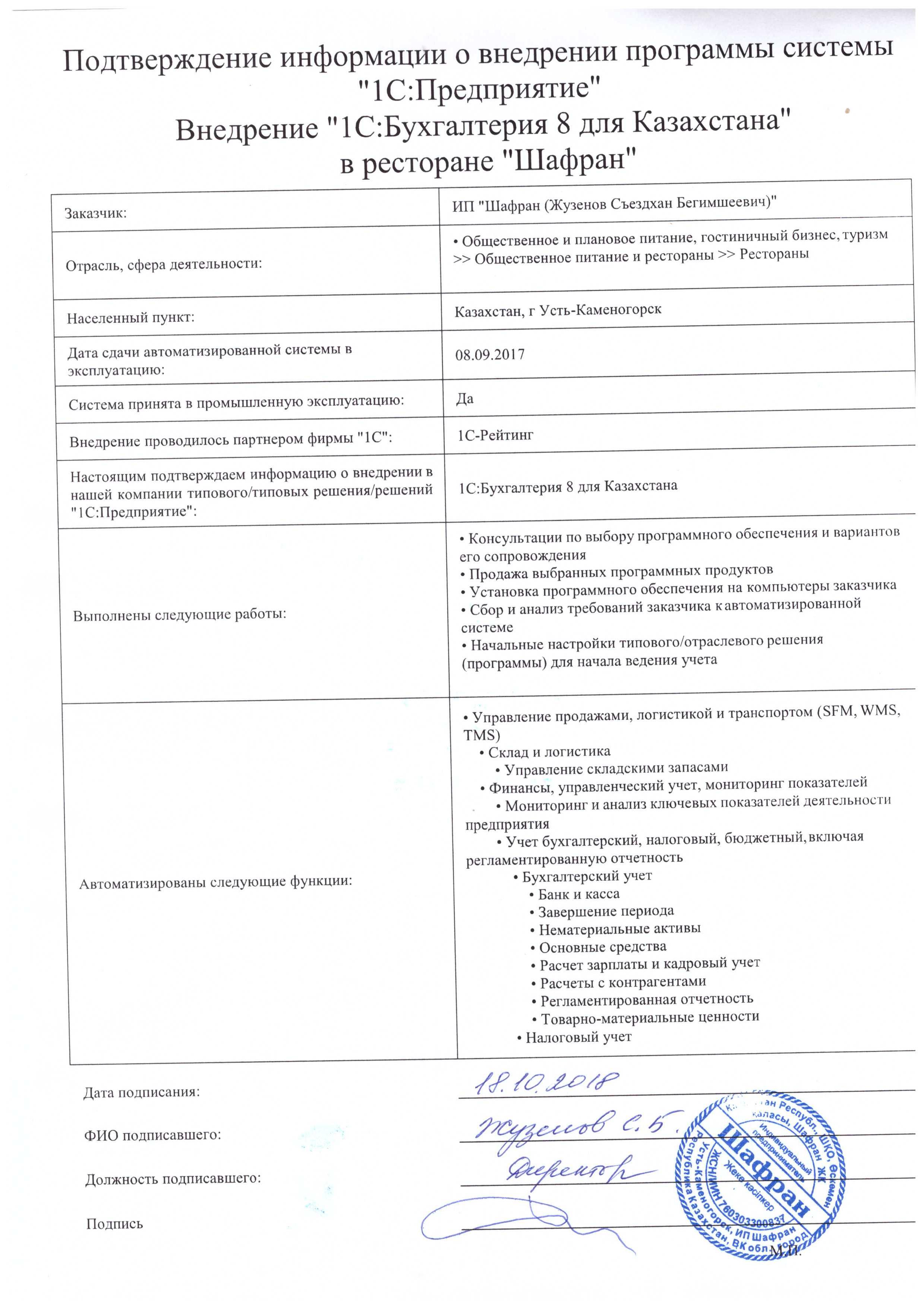 | Внедренное типовое решение: | 1С:Бухгалтерия 8 для Казахстана |