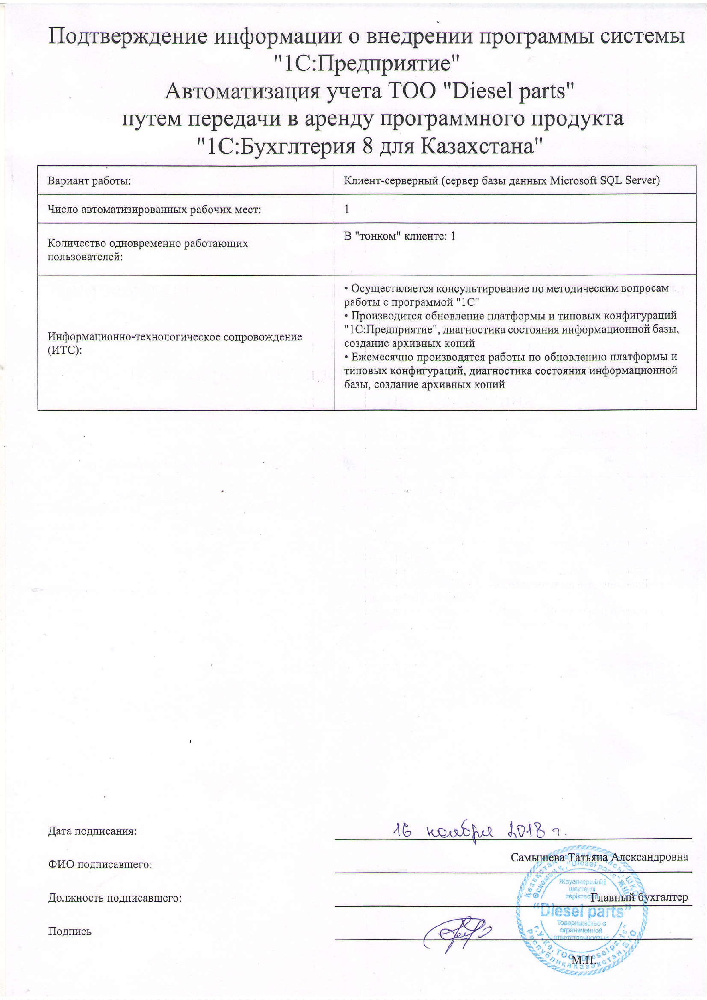 - Ежемесячно производятся работы по обновлению платформы и типовых конфигураций, диагностика состояния информационной базы, создание архивных копий