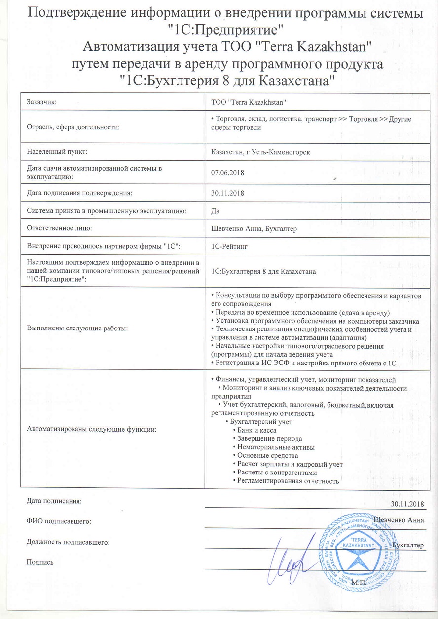 | Арендованное типовое решение: | 1С:Бухгалтерия для Казахстана |