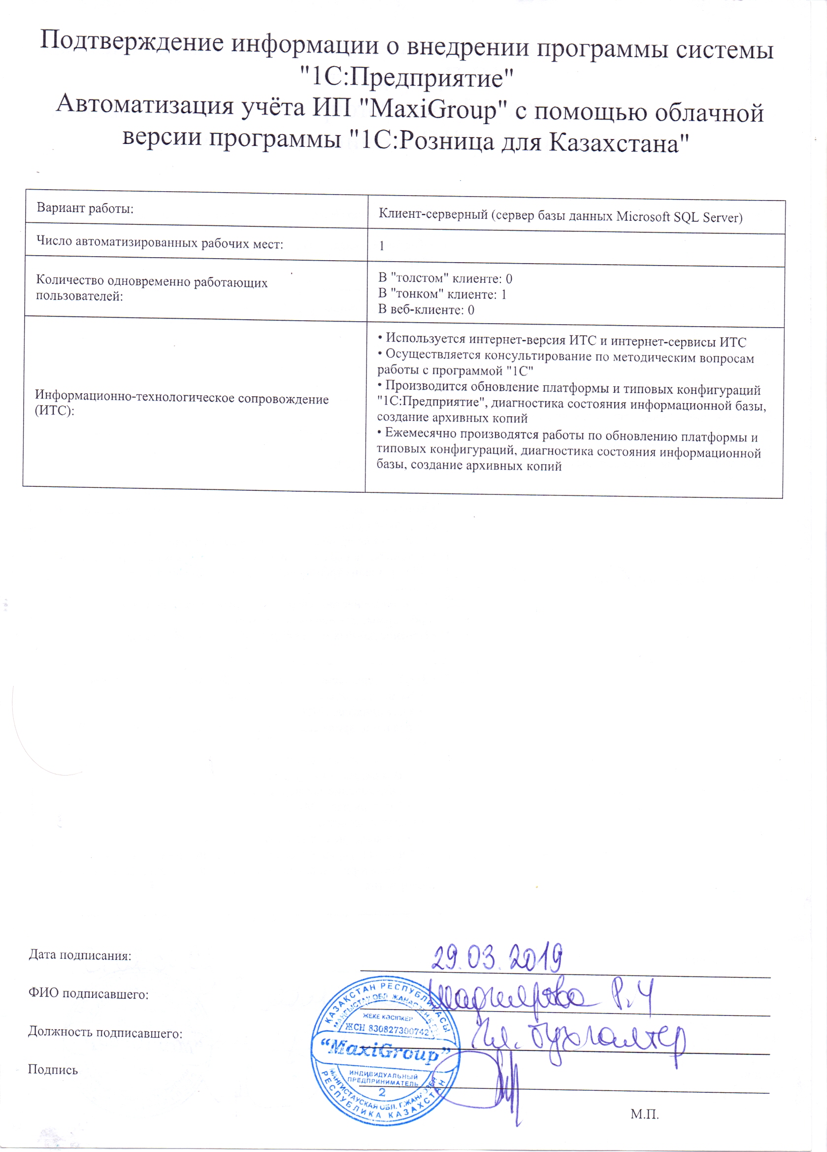 | Внедренное типовое решение: | 1С:Розница 8 для Казахстана |