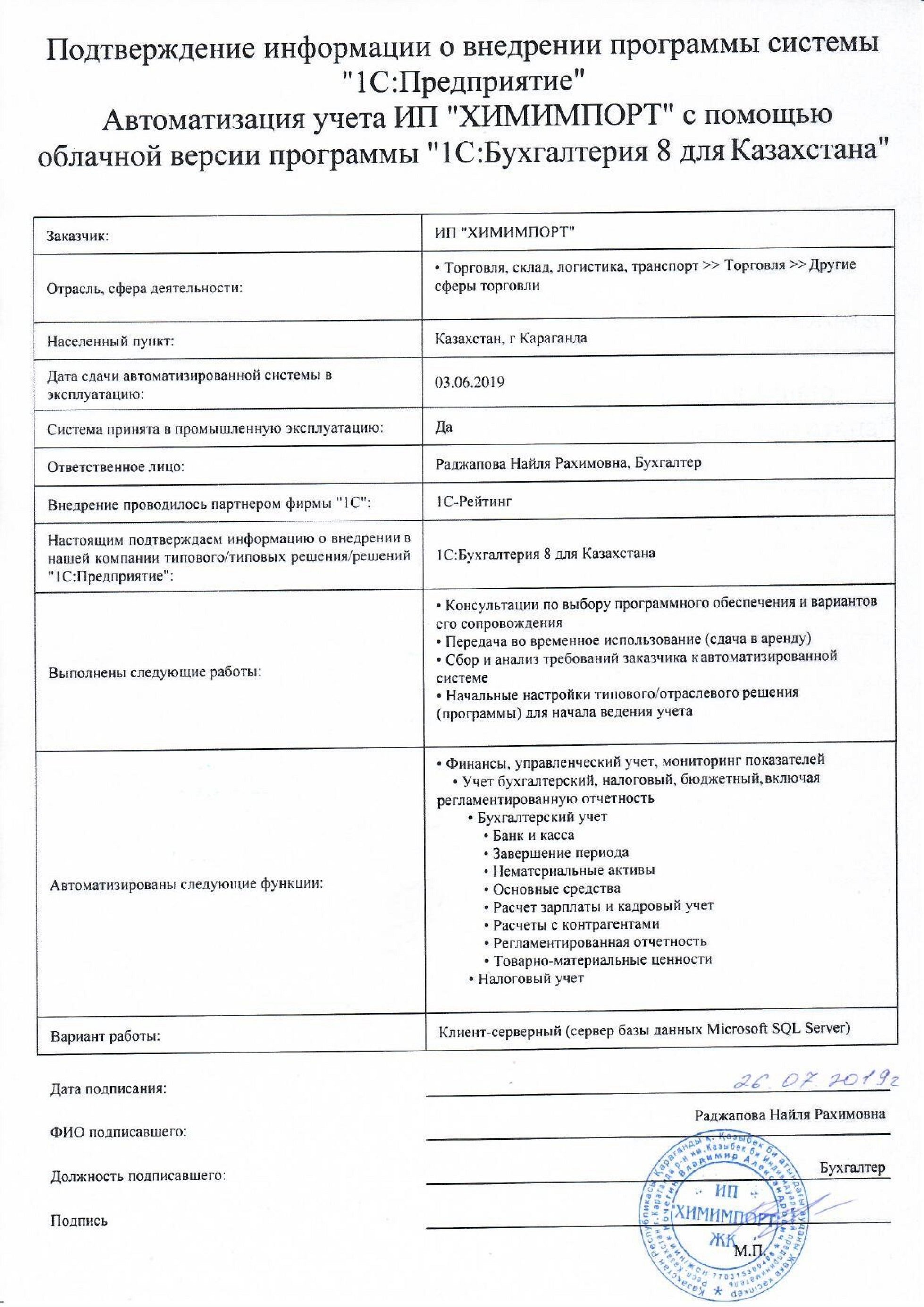 | Арендованное типовое решение: | 1С:Бухгалтерия для Казахстана |