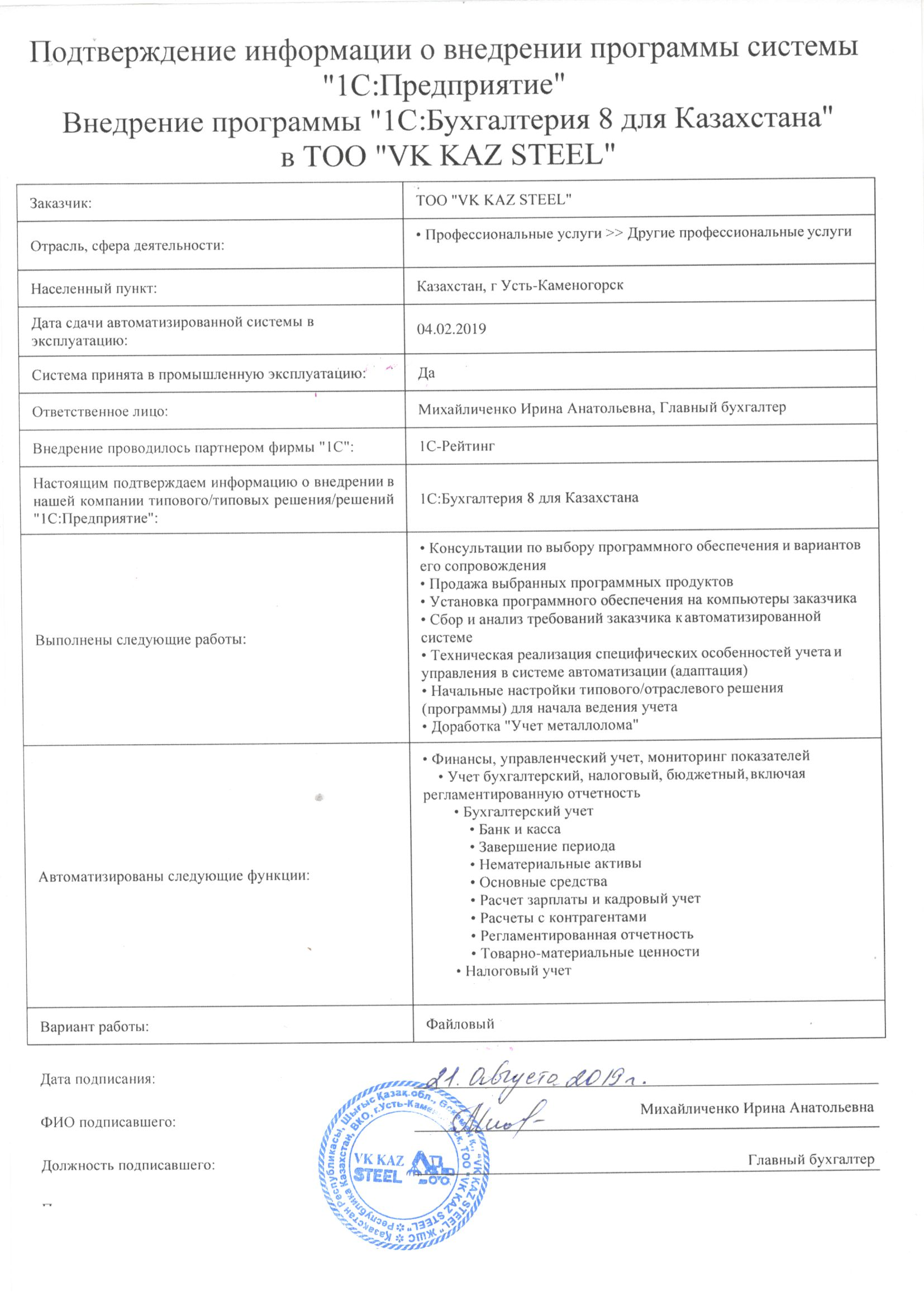 | Внедренное типовое решение: | 1С:Бухгалтерия 8 для Казахстана |