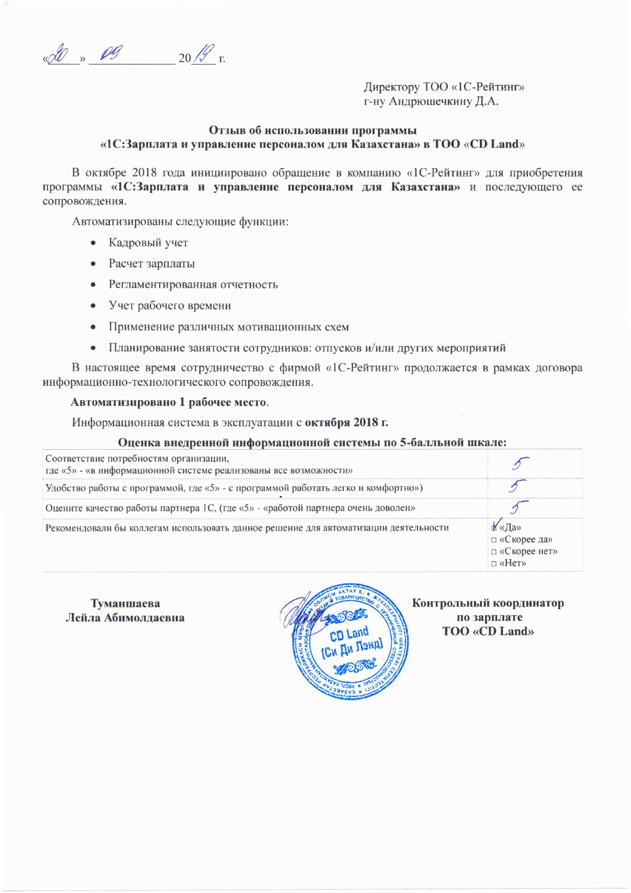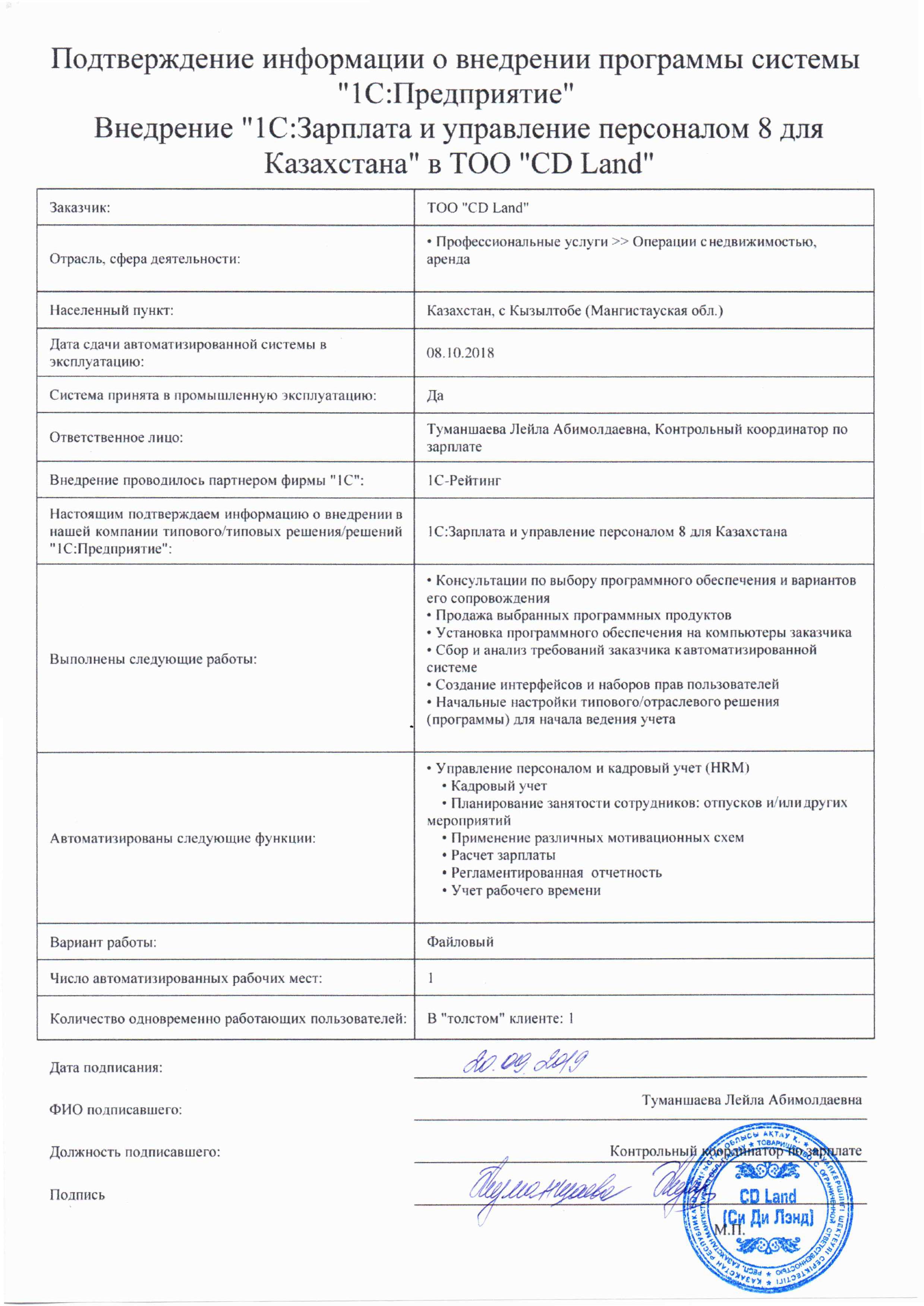 | Внедренное типовое решение: | 1С:Зарплата и Управление персоналом для Казахстана |