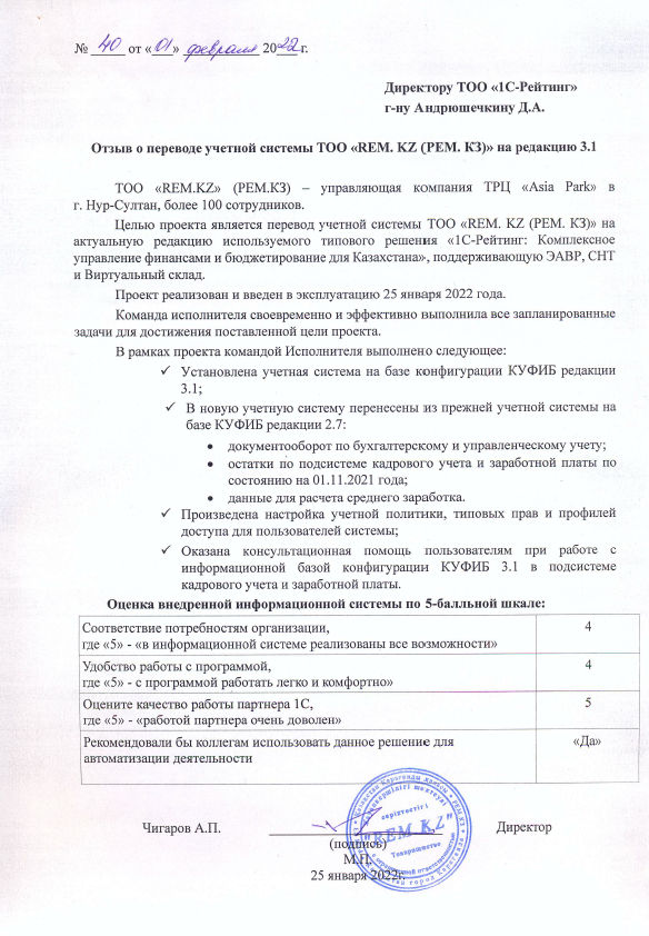 Перевод учетной системы ТОО «REM. KZ (РЕМ. КЗ)» на актуальную редакцию используемого типового решения «1С-Рейтинг: Комплексное управление финансами и бюджетирование для Казахстана», поддерживающую ЭАВР, СНТ и Виртуальный склад.