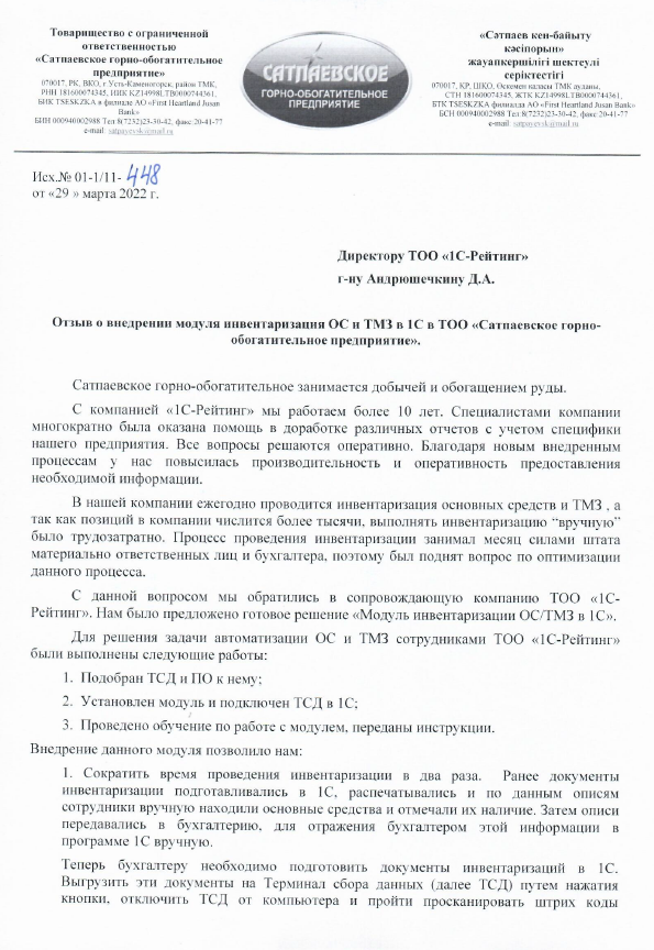 Тип проекта: Внедрение модуля инвентаризации ОС и ТМЗ в 1С