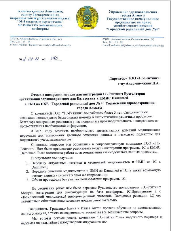 - Внедрение модуля для интеграции 1С-Рейтинг: Бухгалтерия организации здравоохранения для Казахстана с КМИС Damumed.