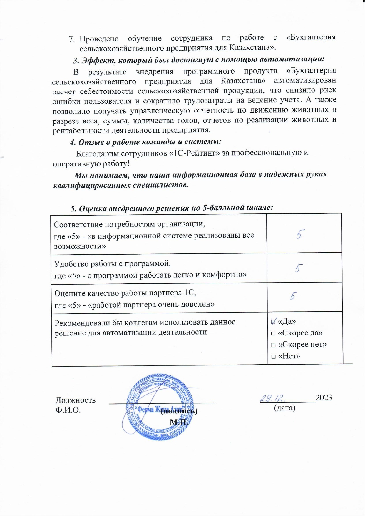 • Проведено обучение сотрудника по работе с «1С:Бухгалтерия сельскохозяйственного предприятия для Казахстана».