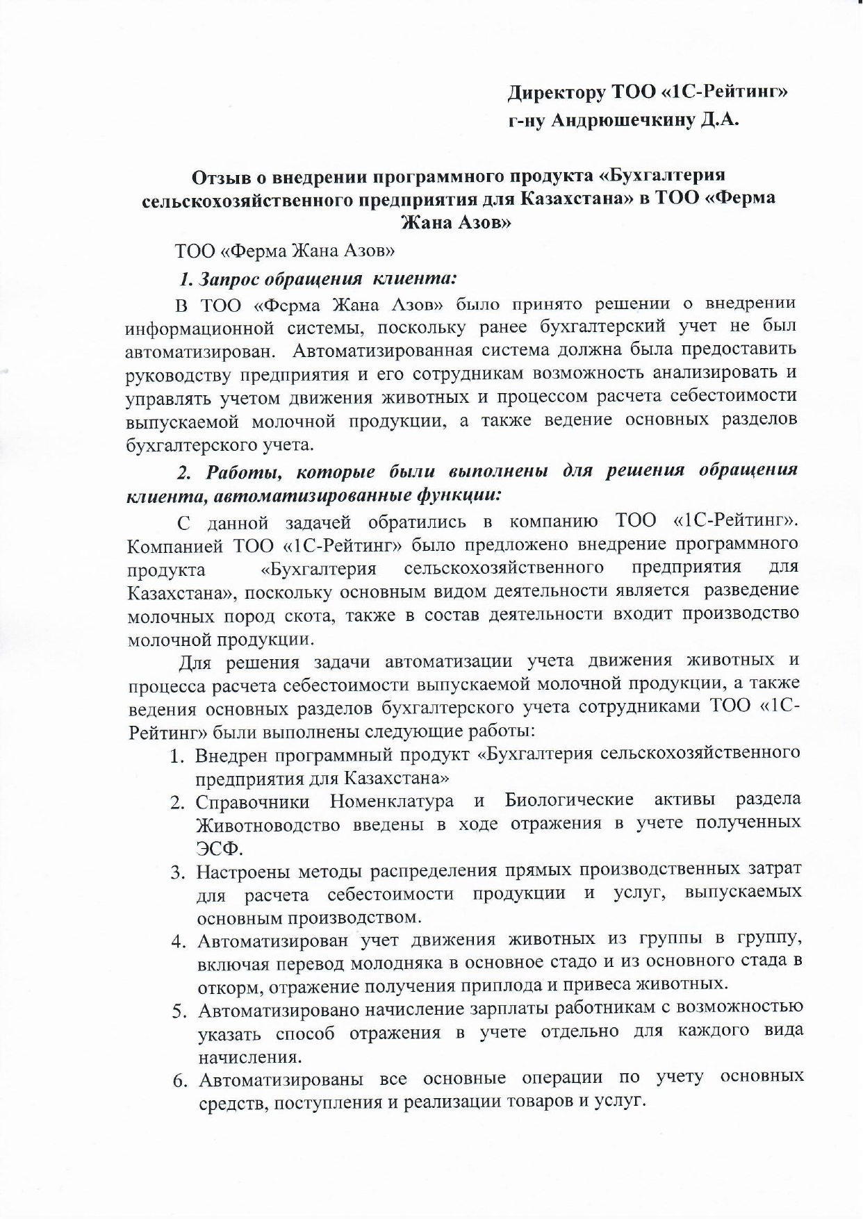 Внедрение облачной версии программы «1С:Бухгалтерия сельскохозяйственного предприятия для Казахстана» в TOO «Ферма Жана Азов»