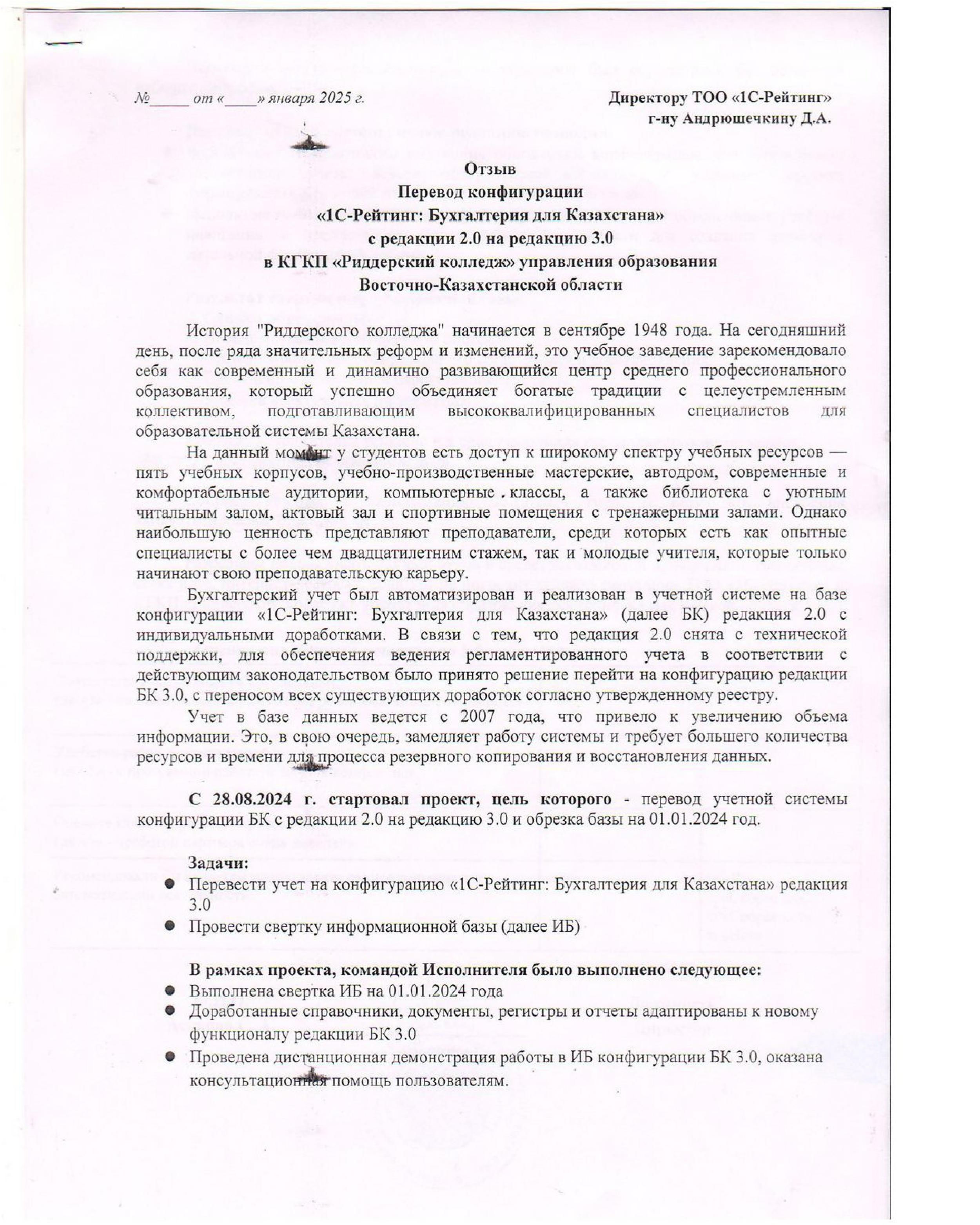 Бухгалтерский учет был автоматизирован и реализован в учетной системе на базе конфигурации «1С:Бухгалтерия для Казахстана» редакция 2.0 с индивидуальными доработками. В связи с тем, что редакция 2.0 снята с технической поддержки, для обеспечения ведения регламентированного учета в соответствии с действующим законодательством было принято решение перейти на конфигурацию редакции БК 3.0, с переносом всех существующих доработок согласно утвержденному реестру.