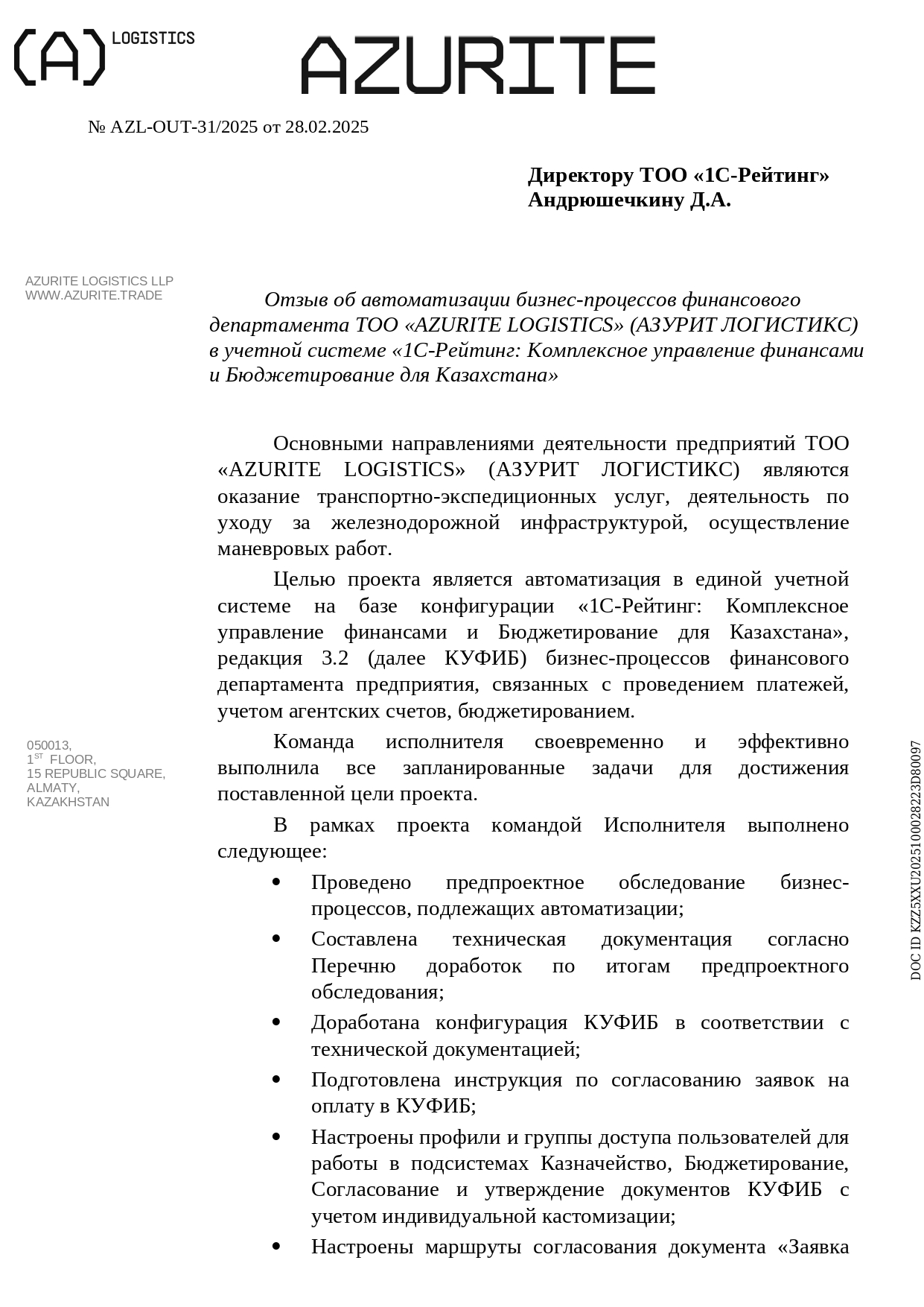 Автоматизация в единой учетной системе на базе конфигурации «1С-Рейтинг: Комплексное управление финансами и Бюджетирование для Казахстана», редакция 3.2 (далее КУФИБ) бизнес-процессов финансового департамента предприятия, связанных с проведением платежей, учетом агентских счетов, бюджетированием.