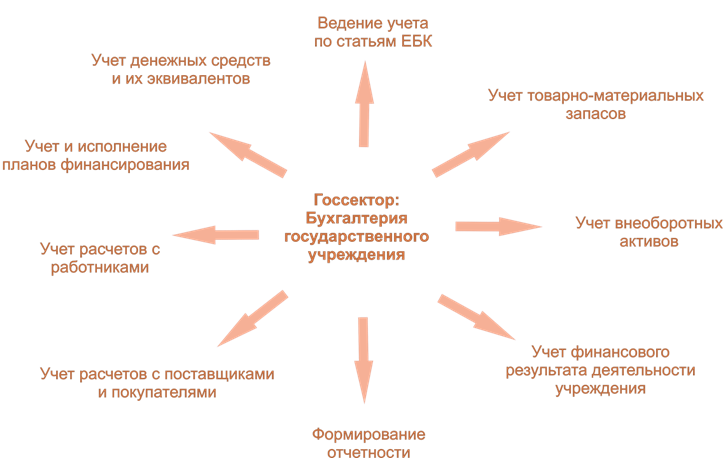 «Госсектор: Бухгалтерия государственного учреждения для Казахстана» обеспечивает автоматизацию бухгалтерского учета по следующим разделам:
