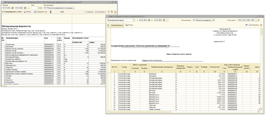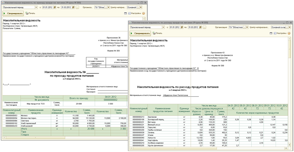 Предусмотрено формирование Накопительных ведомостей по приходу и расходу продуктов питания (формы № 300 и № 399), ведомостей расхода продуктов питания по категориям довольствующихся, отчетов по раскладкам, Сводов накопительных ведомостей по приходу и расходу продуктов питания (мемориальных ордеров 11 и 12).