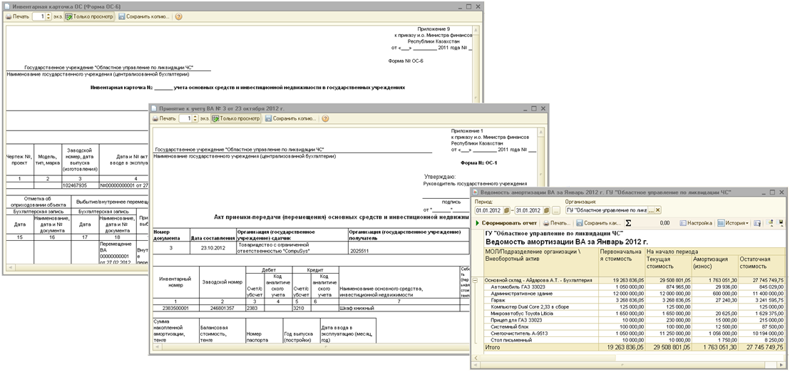 Предусмотрено формирование ведомости начисления амортизации внеоборотных активов, печатных форм инвентарных карточек учета объектов (формы ОС-6, НОС-6), установленных печатных форм первичных документов по учету движения стоимости ВА.